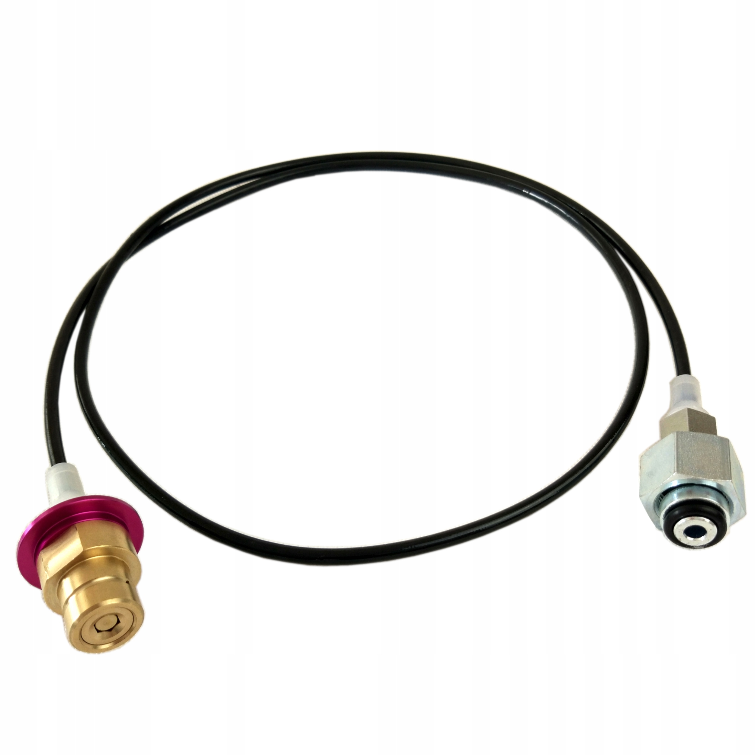 - Кінці кабелю: гайка, яку потрібно пригвинтити до великого циліндра CO2 (стандартна різьба) - PIN-клапан із рожевою шайбою встановлений на пристрій Soda Stream замість картриджа