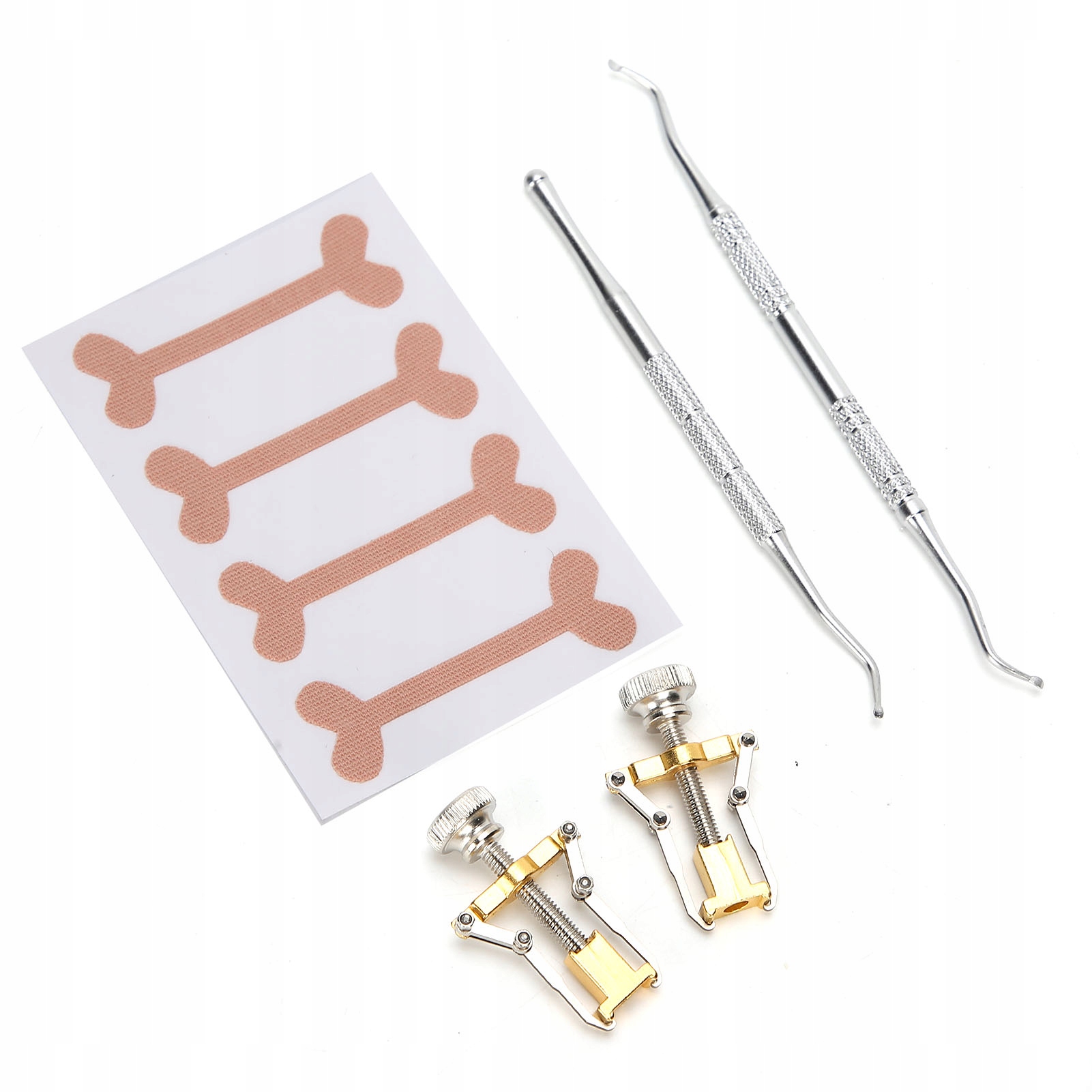 1. Інкрустрований пластир нігтів: Цей продукт має 3-шар-структуру, а зовнішній шар виготовлений з стрункого і надзвичайно гнучкого матеріалу, який має хорошу проникність повітря і схожий на колір шкіри. Внутрішній шар приймає дуже гнучкий тяговий ремінь, який може створити гнучку силу, щоб витягнути цвях, коли він кріпиться до поверхні нігтя. Його можна прикріпити до нігтя, щоб щільно підтримувати цвях, який можна легко використовувати. Використовуйте цвях, щоб поступово повертатися до нормального ступеня кривизни. Нижній шар клею виготовлений з високоякісного клею, який ідеально підходить і не пошкодить нігті.