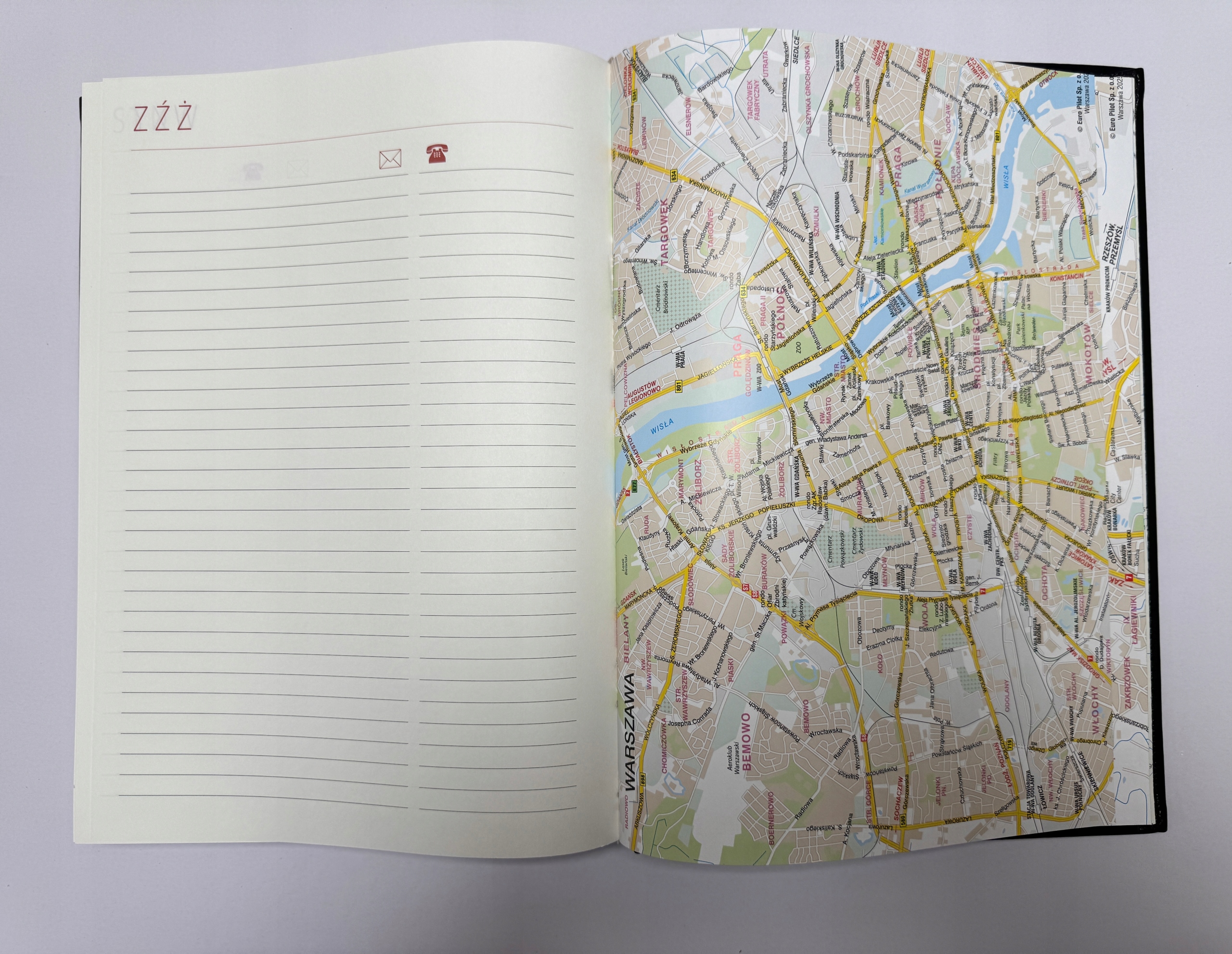 - 8 сторінок із картами головних польських міст, картою Польщі та картою Європи.