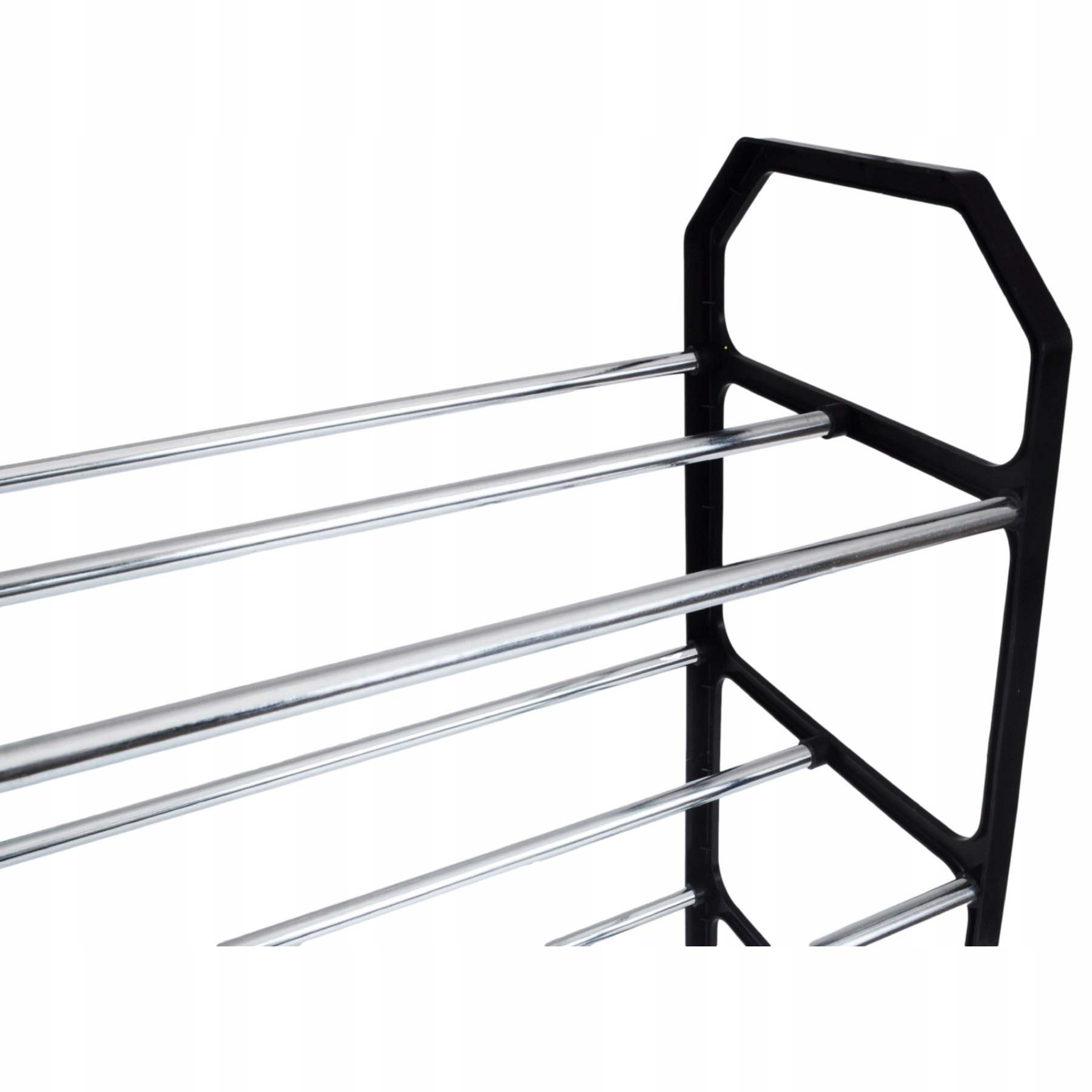 Практична полиця для взуття, виготовлена з пластику з металевими перекладинами. Виріб характеризується естетичним, сучасним виглядом та швидким і легким монтажем без інструментів! Різне розташування отворів дозволяє адаптувати полиці до різних розмірів взуття.