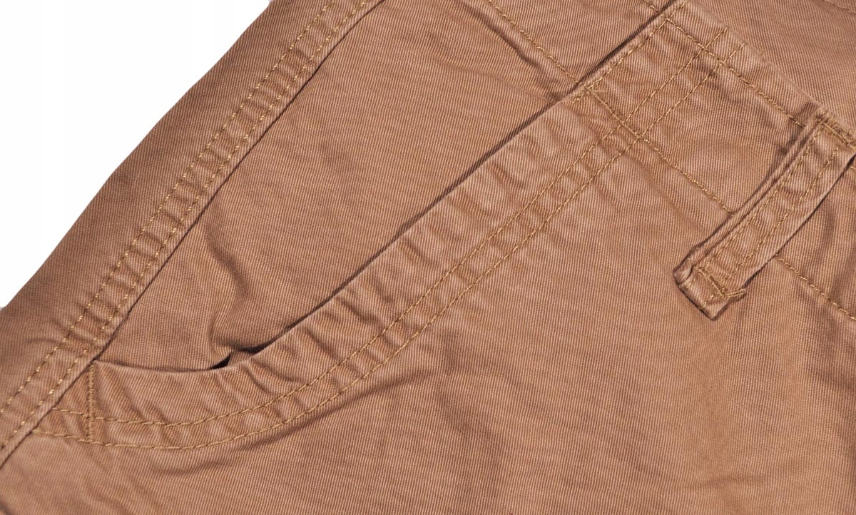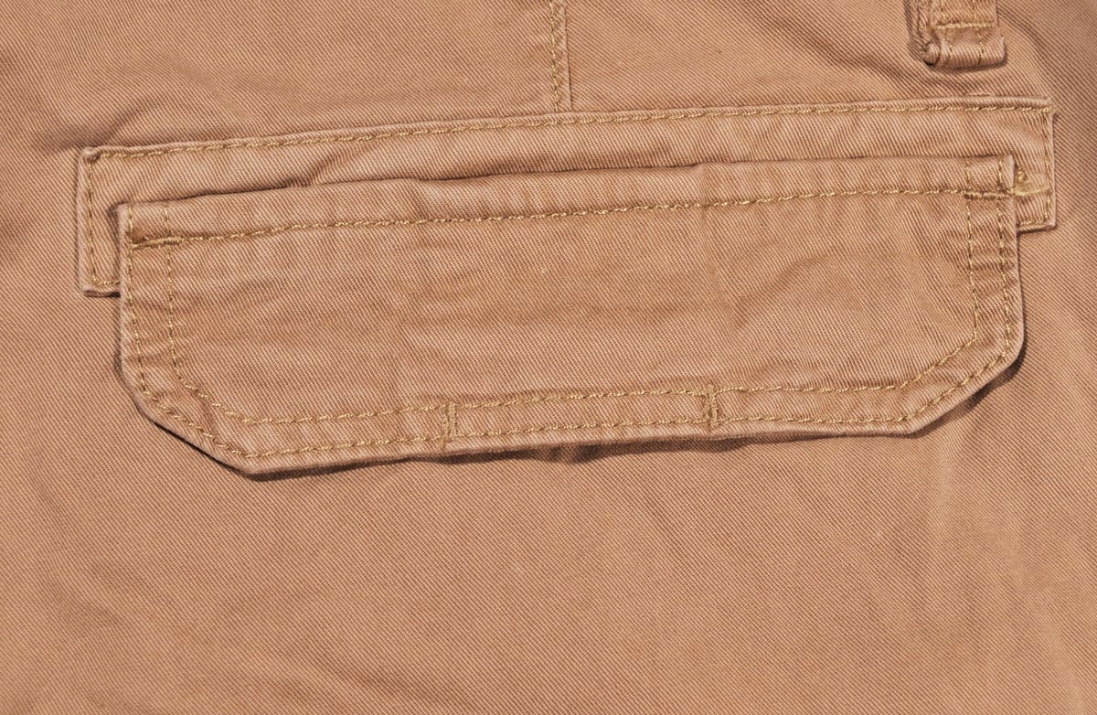 Чоловічі тканинні короткі шорти на гудзиках. Передні кишені, бічні кишені, вставні; задні вшиті, з клапаном, що застібається на гудзик. Збоку на штанинах є додаткові кишені з клапаном, що застібається на підписаний ґудзик. Колір коричневий.