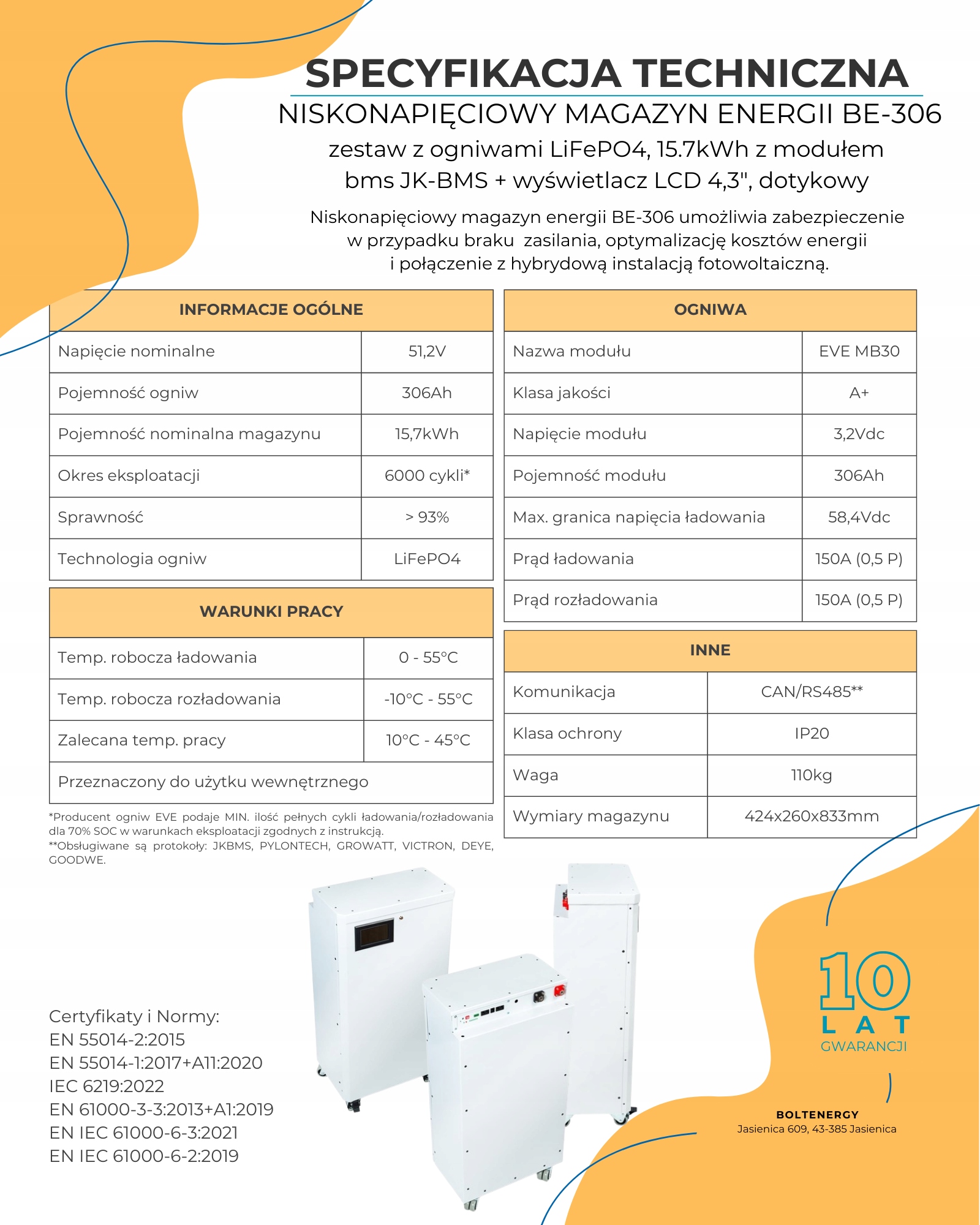 Сучасні та надійні накопичувачі енергії Boltenergy - розроблені та виготовлені в Польщі з урахуванням найвищої якості та надійності. Наші накопичувачі LiFePO4 є ідеальним рішенням для будинків і компаній, які шукають ефективні системи зберігання енергії. На борту складу є 16 елементів LiFePO4 від EVE Energy, а також пристойний, безвідмовний BMS від JK.