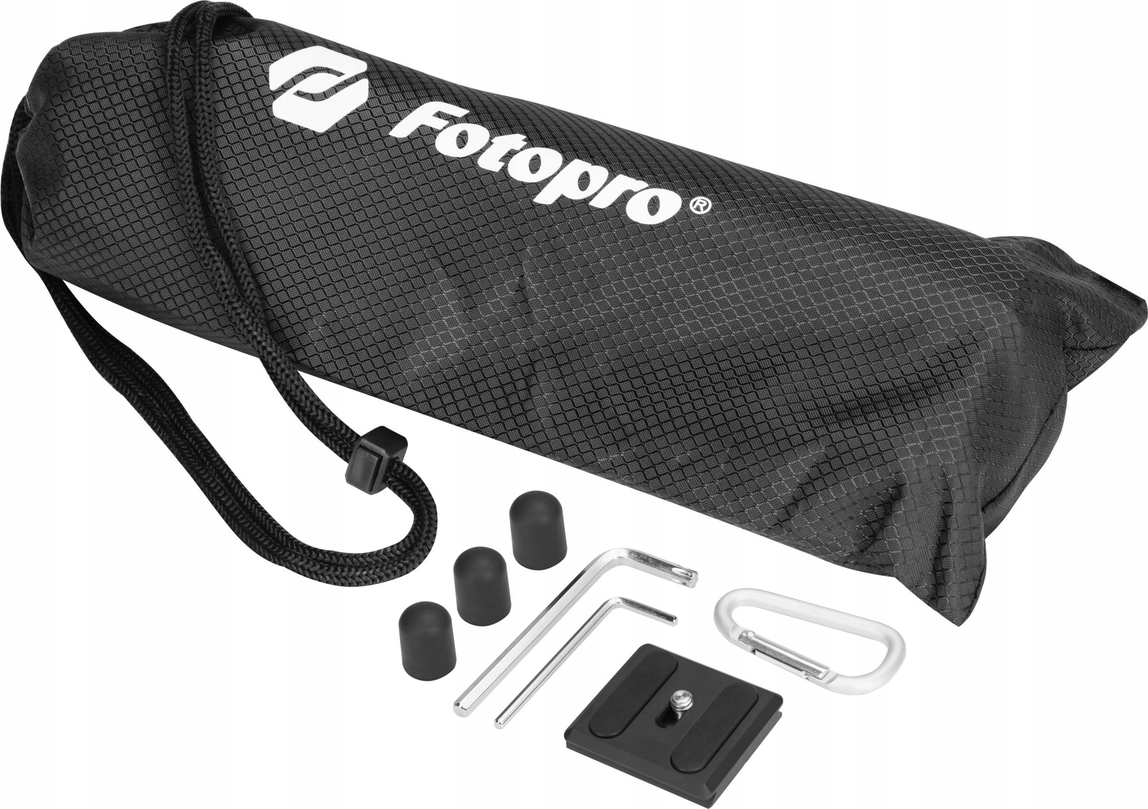 Набір включає чохол із карабіном, корисний під час транспортування, і набір запасних гумових чохлів для ніжок штатива.
