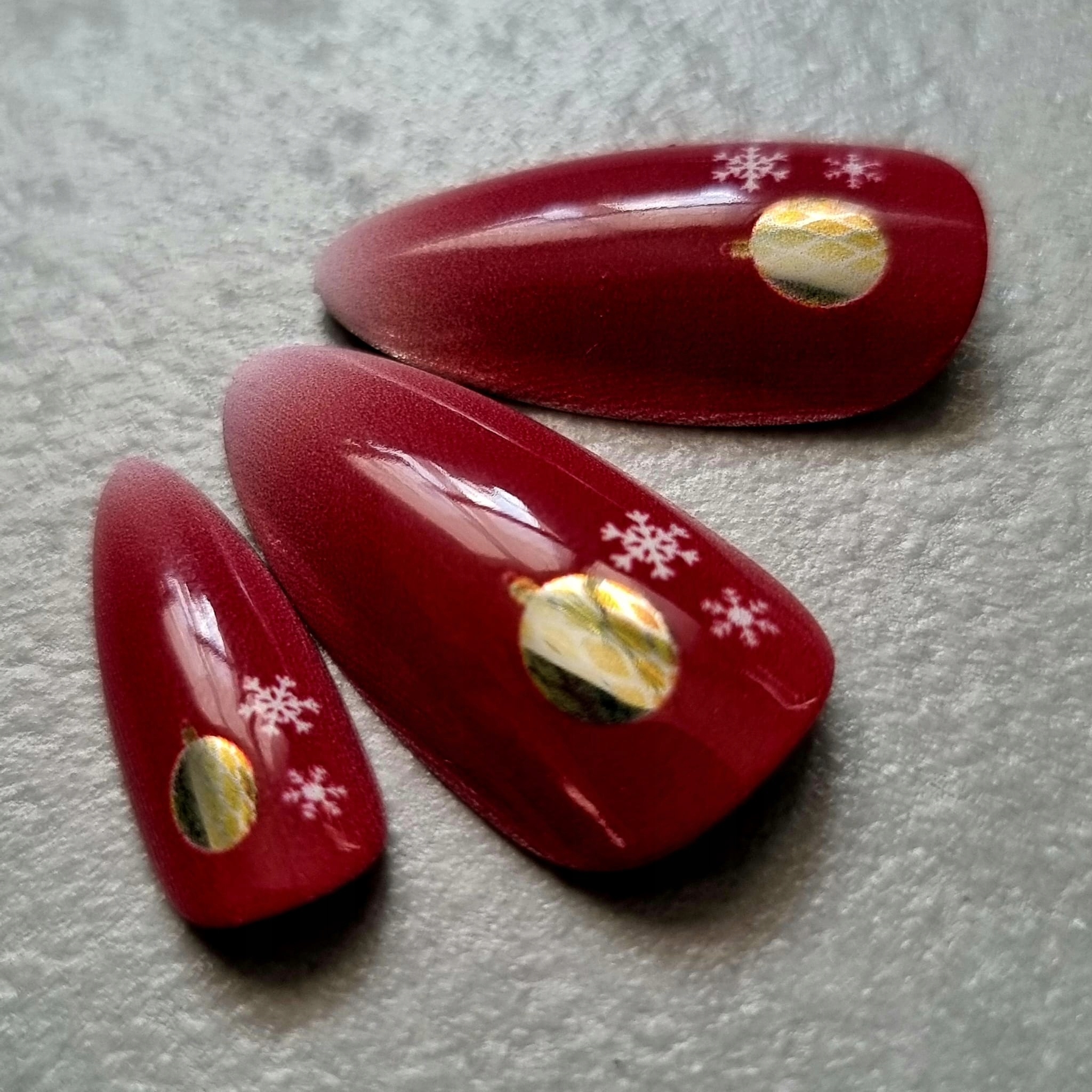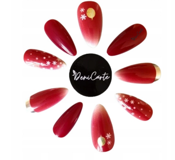 ✔️ Тіпси готові, нігтімигдальні. Наклеювання штучних кольорових гелевих нігтів. Червоні кінчики нігтів із різдвяними прикрасами.