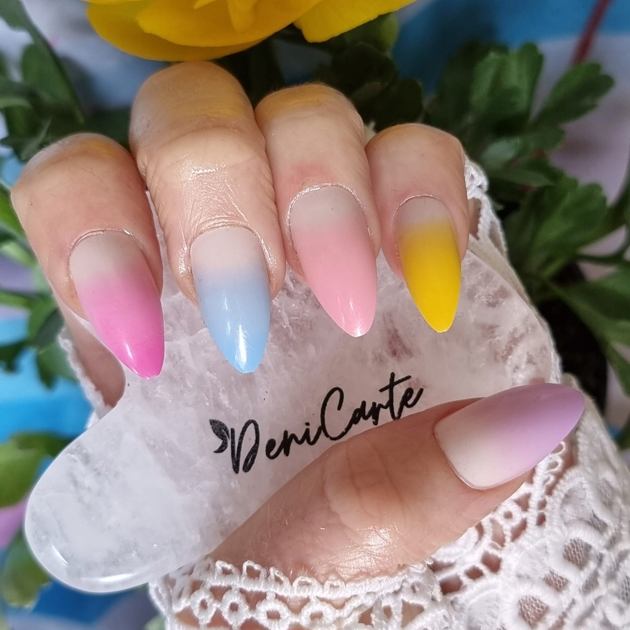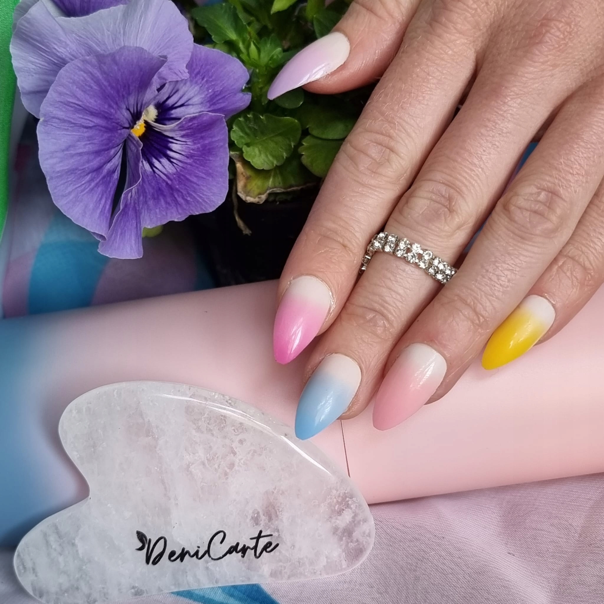 ✔️Вибрана модель у красивих, блискучих відтінках рожевого, синій, фіолетовий і жовтий з ефектом омбре. Мигдалеподібні нігті.