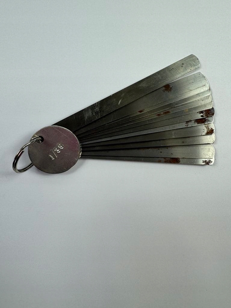 Механічний щуп із діапазоном вимірювання 0,05–1,00 мм, оснащений 20 вимірювальними лезами 150 мм завдовжки та 13 мм завширшки. Стулки мають овальний кінець, що полегшує вставлення в щілини та точне читання проміжків. Примірник походить зі складу і не використовувався в майстерні, але на поверхні аркушів помітні сліди поверхневої корозії та знебарвлення внаслідок тривалого зберігання. Це не впливає на можливість вимірювання після очищення.