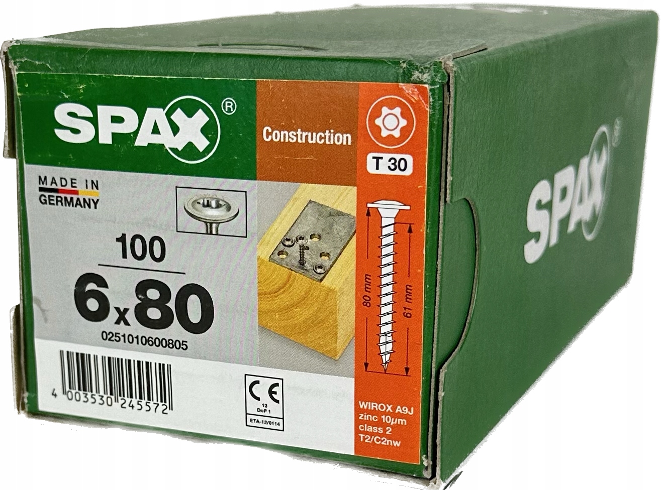 Столярні шурупи для дерев'яних конструкцій 6 х 80 мм - пластинчаста головка - SPAX WIROX A9j - клас 2 - T2/C2nw - різьба 61 мм - упаковка 100 шт