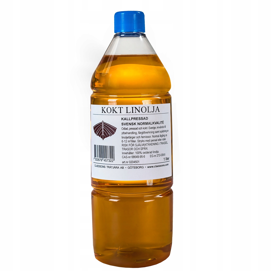 Це високоякісна варена лляна олія від шведських фермерів. Він легкий, прозорий, не містить води та чистий, щоб забезпечити найкращий захист деревини та поверхонь. Метод виробництва олії робить її частинки приблизно в 100 разів більшими порівняно з сирою лляною олією. Це означає, що він створює ще більш міцний і блискучий поверхневий шар і висихає набагато швидше. У такому вигляді лляна олія погано проникає в поверхню деревини, тому для ґрунтування використовують сирий продукт, а для обробки поверхонь — проварений.