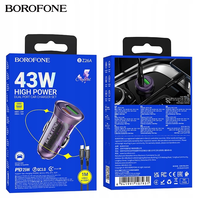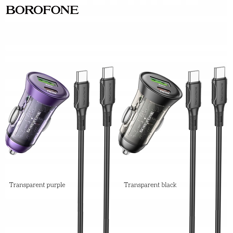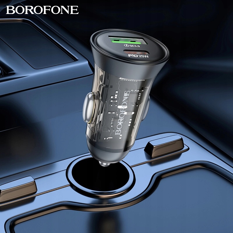 Borofone BZ26A Shadow is a fast car charger with two output sockets, one USB Type-C/type C/type C with a maximum power of 25W and one The USB-A socket in the Quick Charge 3.0 / QC3.0 Стандарт з максимальною потужністю 18 Вт, що підтримує такі швидкі стандарти зарядки, як QC3.0 / QC2.0 / Huawei FCP, Apple PD20W або Samsung AFC. Комплект включає додатковий кабель доставки потужності / PD з USB Type-C / Type C з 1 м / 100 см завдовжки. 12 Pro Max / 13 Mini / 13/13 Pro / 13 Pro Max / 14/14 Plus / 14 Pro Max / 15/15 Plus / 15 Pro / 15 Pro Max