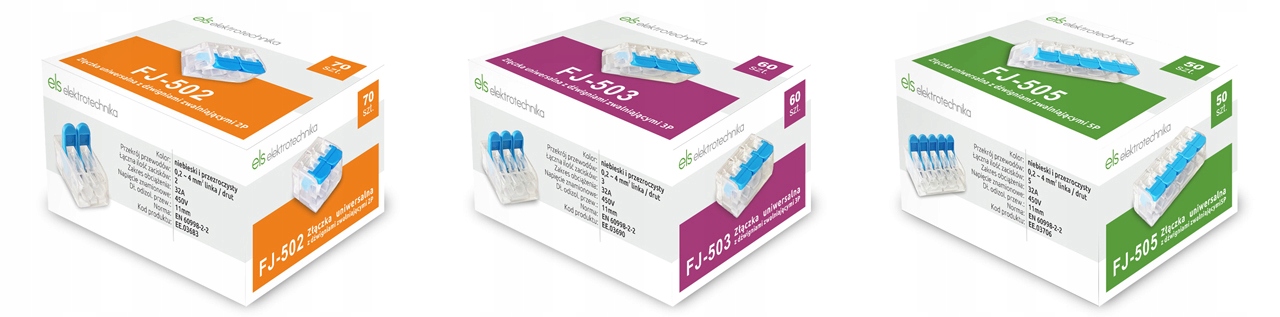 Швидкороз'єм ELS Elektrotechnika FJ-502 використовується для підключення кабелів в електромонтажних коробках, освітлювальній техніці та в розподільних шафах та інші електромонтажні роботи.
