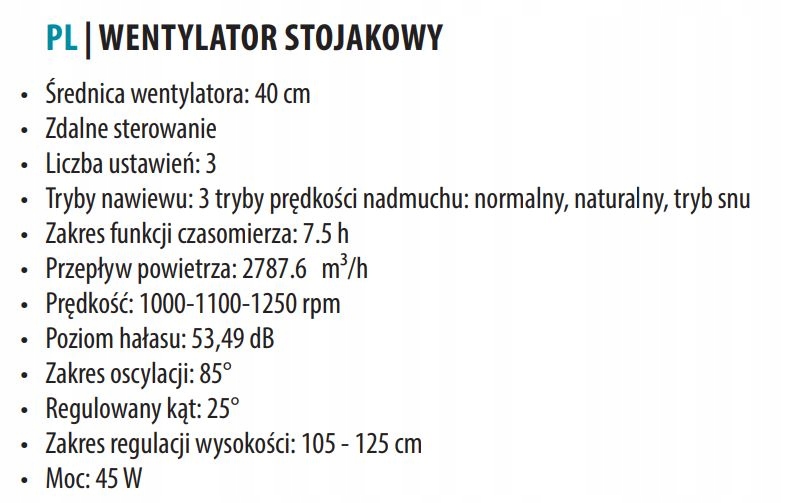 У спекотні дні варто мати обладнання, яке захищає від перегріву, тому розумна ціна. Єдине, що варто придбати цей гідний вентилятор, який ми пропонуємо. Цей вентилятор має діаметр 40 см, 3-ступінчасте регулювання потужності, функцію коливання та кришку пропелера. Незамінний у жарку погоду. Пристрій з потужністю двигуна 50 Вт і максимальною силою повітряного потоку 100 Вт, що дає цілих 1275 обертів в хвилину! Це забезпечує неймовірний результат охолодження 3507 м3 на годину. Цей вентилятор білого кольору оснащений функцією коливання, яка охолоджує кімнату не тільки в одному напрямку. Це надзвичайно тихий підлоговий вентилятор зі стильним дизайном. Його унікальний зовнішній вигляд робить його незамінним елементом кожного сучасного будинку, офісу та фотостудії.