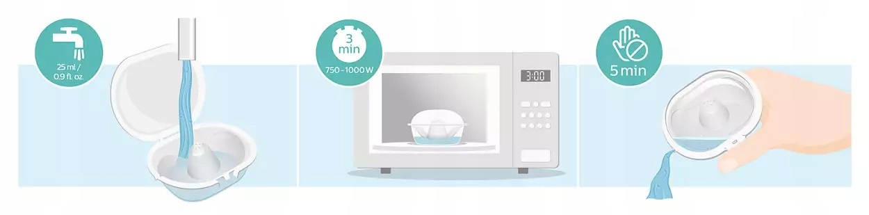 Перед кожним використанням очищайте накладки на соски. Це займає менше 10 хвилин. Опустіть кришки в киплячу воду на п'ять хвилин або скористайтеся спеціальним футляром. Помістити в неї добре промиту оболонку і налити 25 мл води. Потім помістити корпус в мікрохвильову піч і включити потужність 750-1000 Вт на 3 хвилини. Зачекайте п'ять хвилин, поки вони охолонуть. Вилийте воду. Корпуси готові до використання. Цей зручний чохол варто використовувати для чищення чохлів у подорожі. Звичайно, він також використовується для їх зберігання.