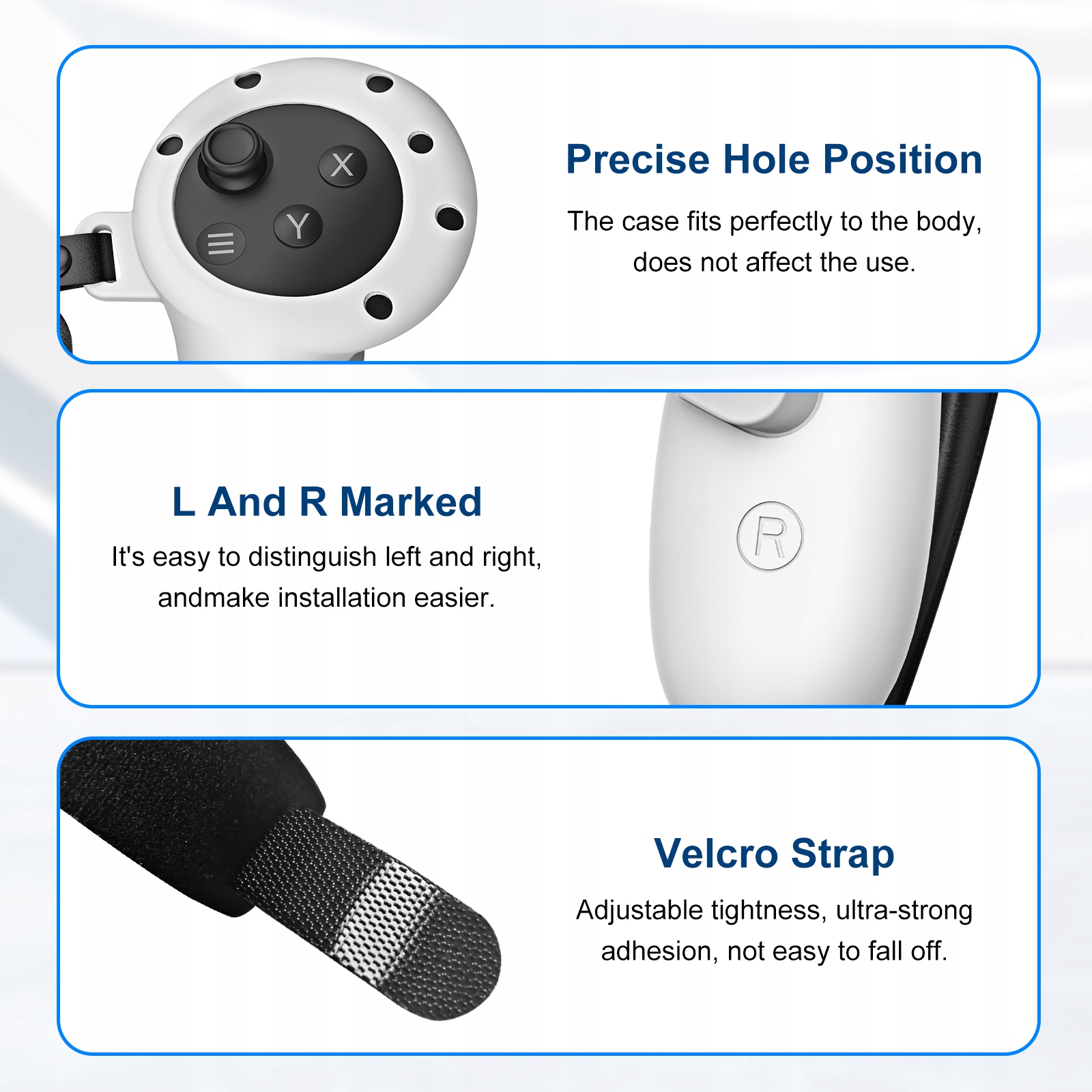 Рекламні сироти, виготовлені з високоякісного силікону, для окулярів Meta Quest 3 для захисту контролерів від впливу чи падіння, що, на жаль, дуже часто трапляється на іграх з світу з світу Meta Quest та Steamvr тощо. Крім того, обкладинки мають регульовані смуги, завдяки якому ви ідеально відповідаєте контролеру з обома руками.