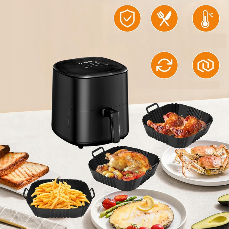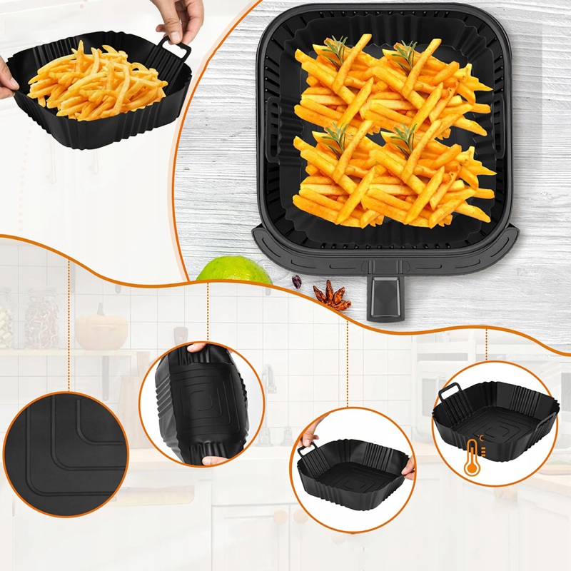 Наша силіконова фритюрниця виготовлена з високоякісного харчового силікону, який є антипригарним, нетоксичним і термостійким до 464°F. Вони міцні та гнучкі, придатні для різноманітного використання, а наші багаторазові силіконові вкладиші є екологічно чистими та економлять більше, ніж одноразові паперові вкладиші аерофритюрниці