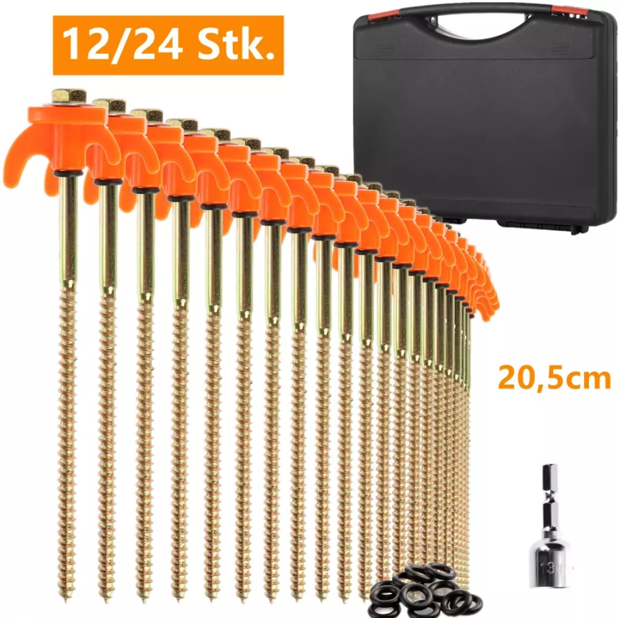 універсальне використання: практичні гачки для наметів використовуються для прикріплення наметів, альтанок, туристів, екранів конфіденційності, несанкціоновань, туристів, аксесуарів для риболовлі та багатьох інших речей! Призначені для використання на кам'янисті, в лісі або на луках, вони оснащені мотузковим тримачем з оком і гачком для кріплення мотузок та напружених ременів!