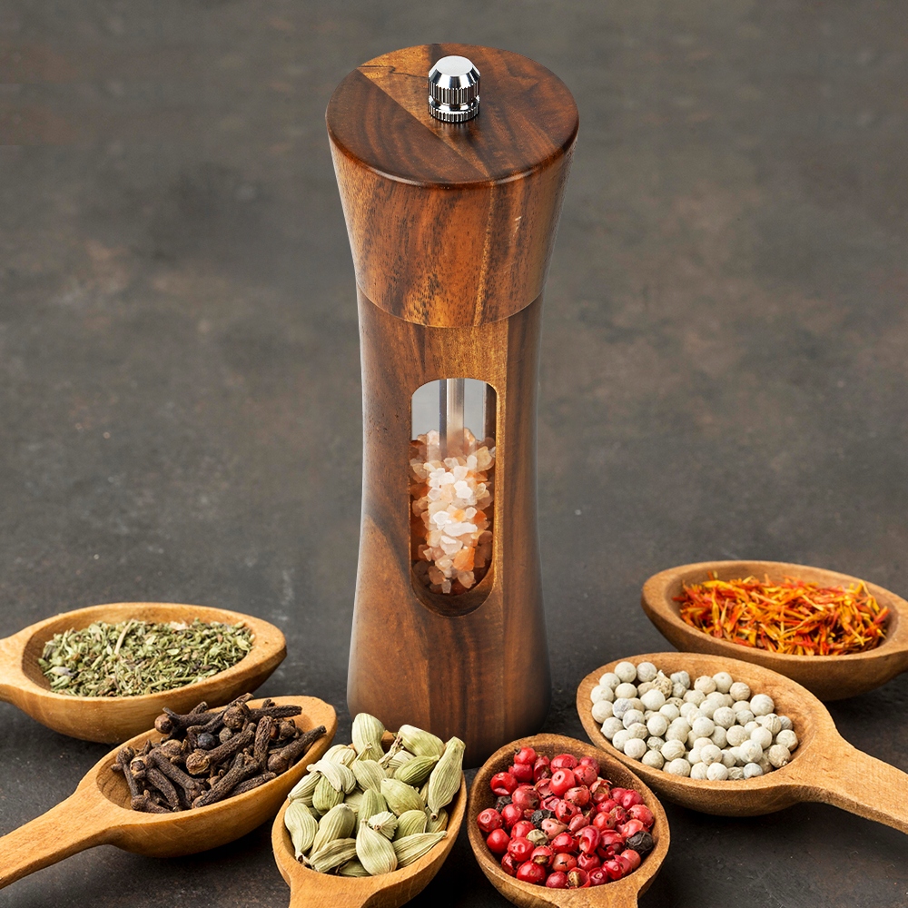 🎁🎁Висока якість:наші млинки для спецій виготовлені з елегантного дерева акації та акрилового скла, з твердою керамічною млином, завдяки високій якості виготовлення млинки забезпечують надійну роботу протягом багатьох років. Індивідуальна текстура деревини робить кожну перечницю унікальною. Оскільки деревина водостійка, ви можете просто почистити її вологою тканиною.