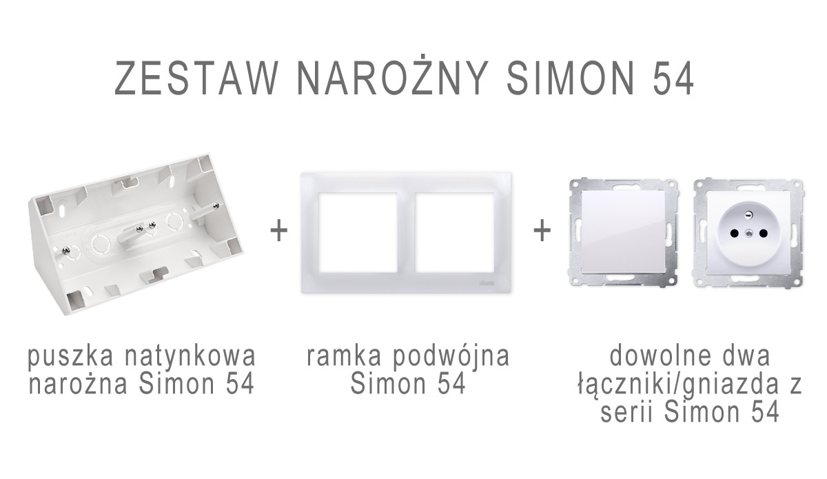 Польський продукт відомої компанії Kontakt Simon. «Simon 54» — це сучасна преміальна лінійка електромонтажного обладнання на основі нового, надійного. і прості в установці механізми, що вирізняються благородною формою і насиченими кольорами. Обладнання функціонує як симетрична каркасна система (1, 2, 3, 4, 5 разів), що дозволяє встановлювати виріб як горизонтально, так і вертикально. Модуль встановлюється в стандартну коробку Ø60 за допомогою гвинтів або швидкого з'єднувача. Доступний повний спектр модулів: вимикачі, кнопки, електричні розетки (також з кришкою - захищені від бризок), IT-розетки, USB, гучномовці, RTV-SAT тощо.