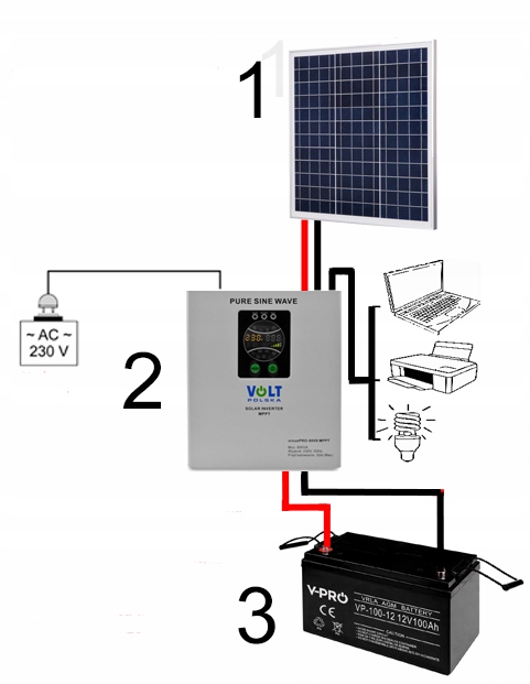 2. Інвертор - енергія від батареї перетворюється на напругу 230В і може використовуватися для живлення приймачі. За відсутності сонця батарею можна заряджати від мережі 230 В, щоб вона завжди була готова до використання в акумуляторі, наприклад, 100 Ач в системі 12 В.