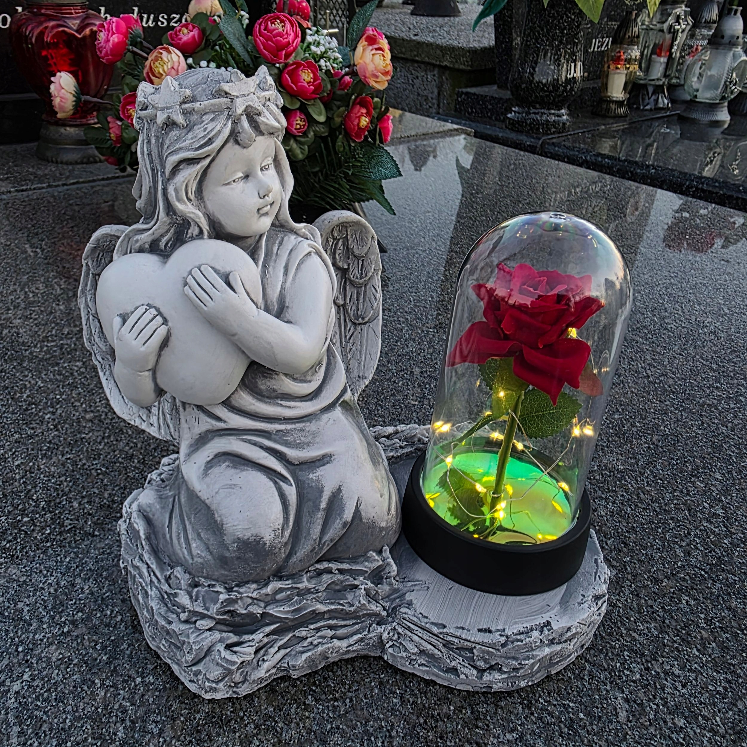 СІРА ГІПСОВА СТАТУЕТКА-ГРОБНИЦЯ Сірий Ангел ВІЧНА ТРОЯНДА Світлодіодна лампа Серце
