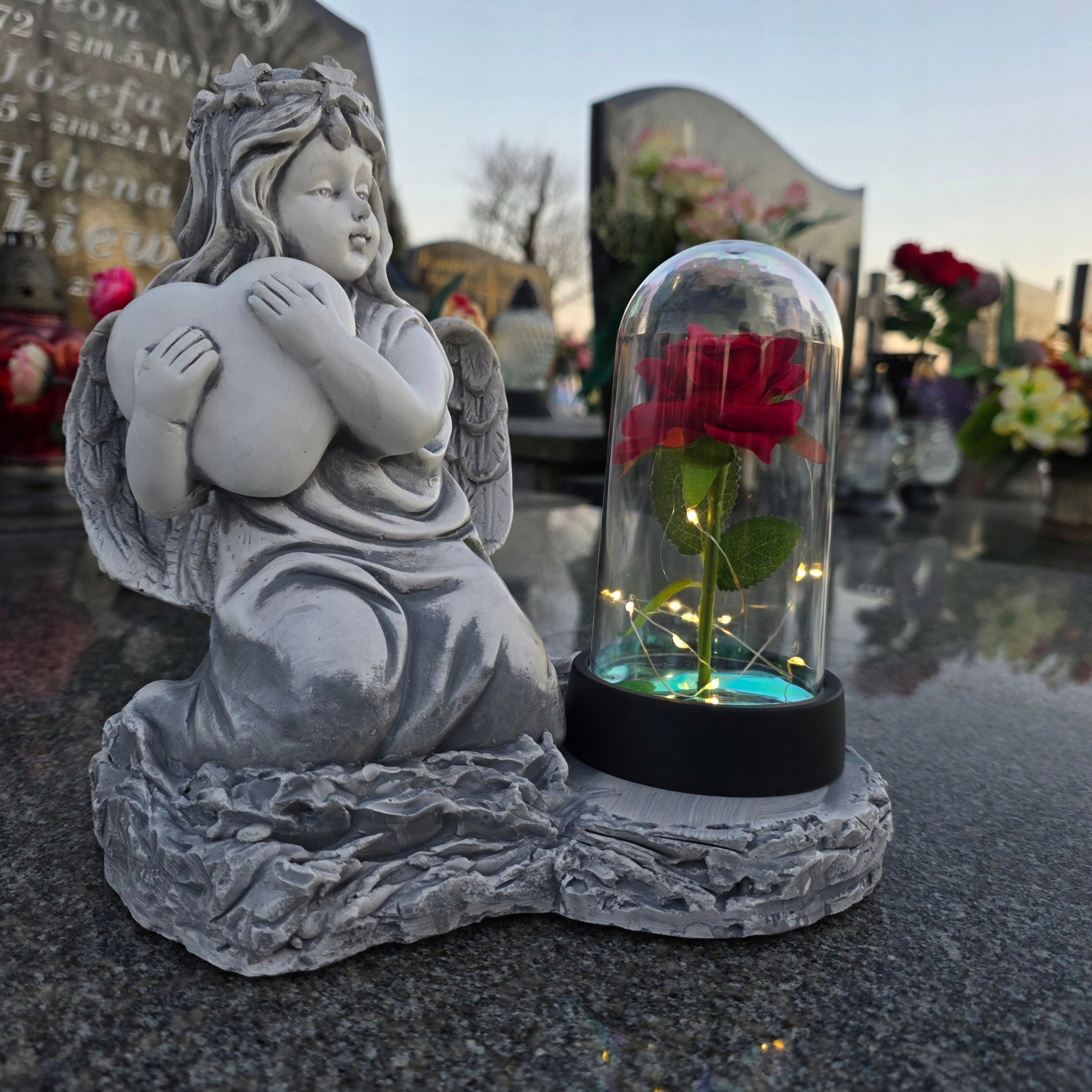 ⭐ ГІПСОВА ФІГУРКА АНГЕЛА СІРОГО КОЛЬОРУ З ІЛЮМІНАЦІЙНОЮ ТРОЯНДОЙ У СКЛЯНІЙ ЛАМПІ - ПРИКРАСА ПАМ'ЯТІ МОГИЛИ ⭐