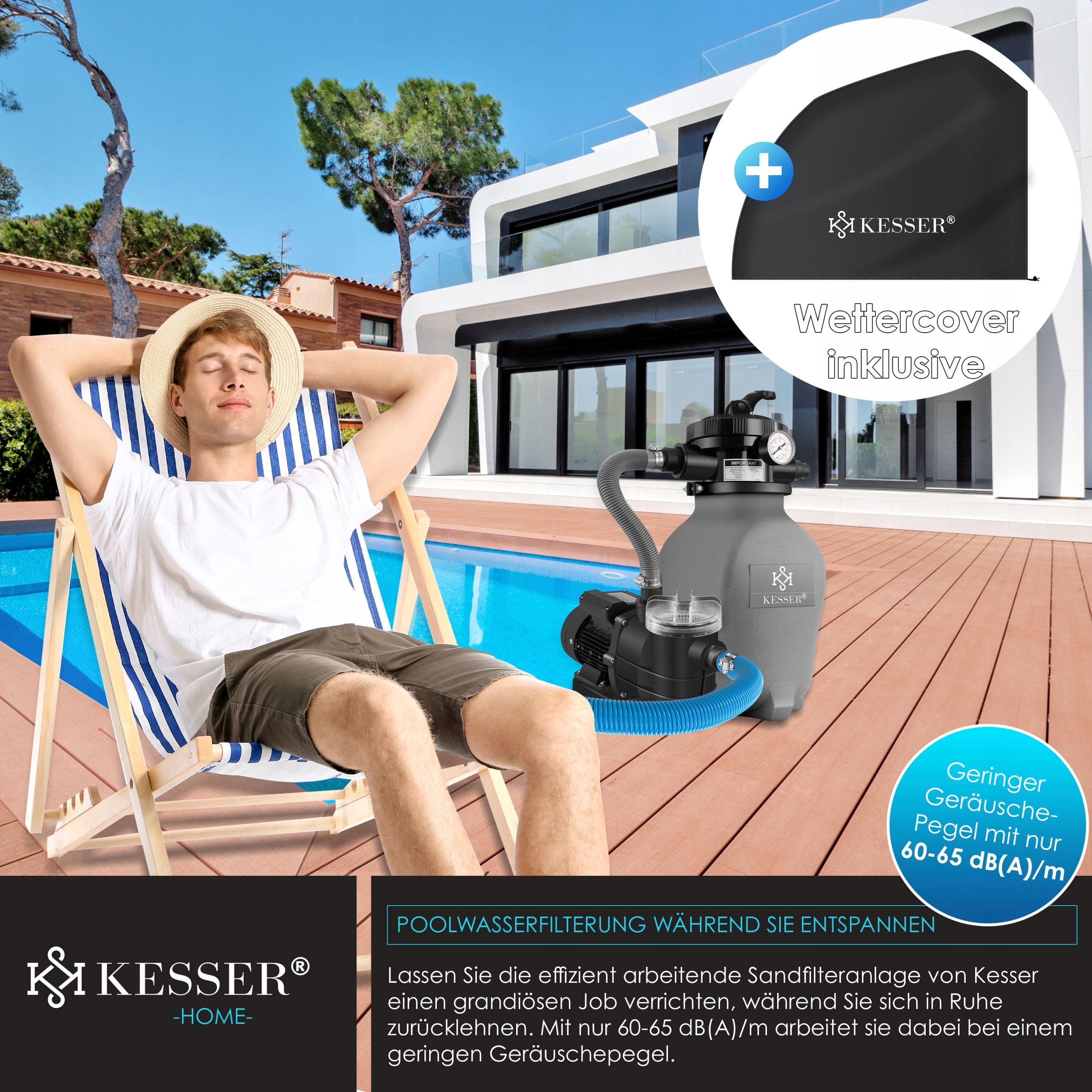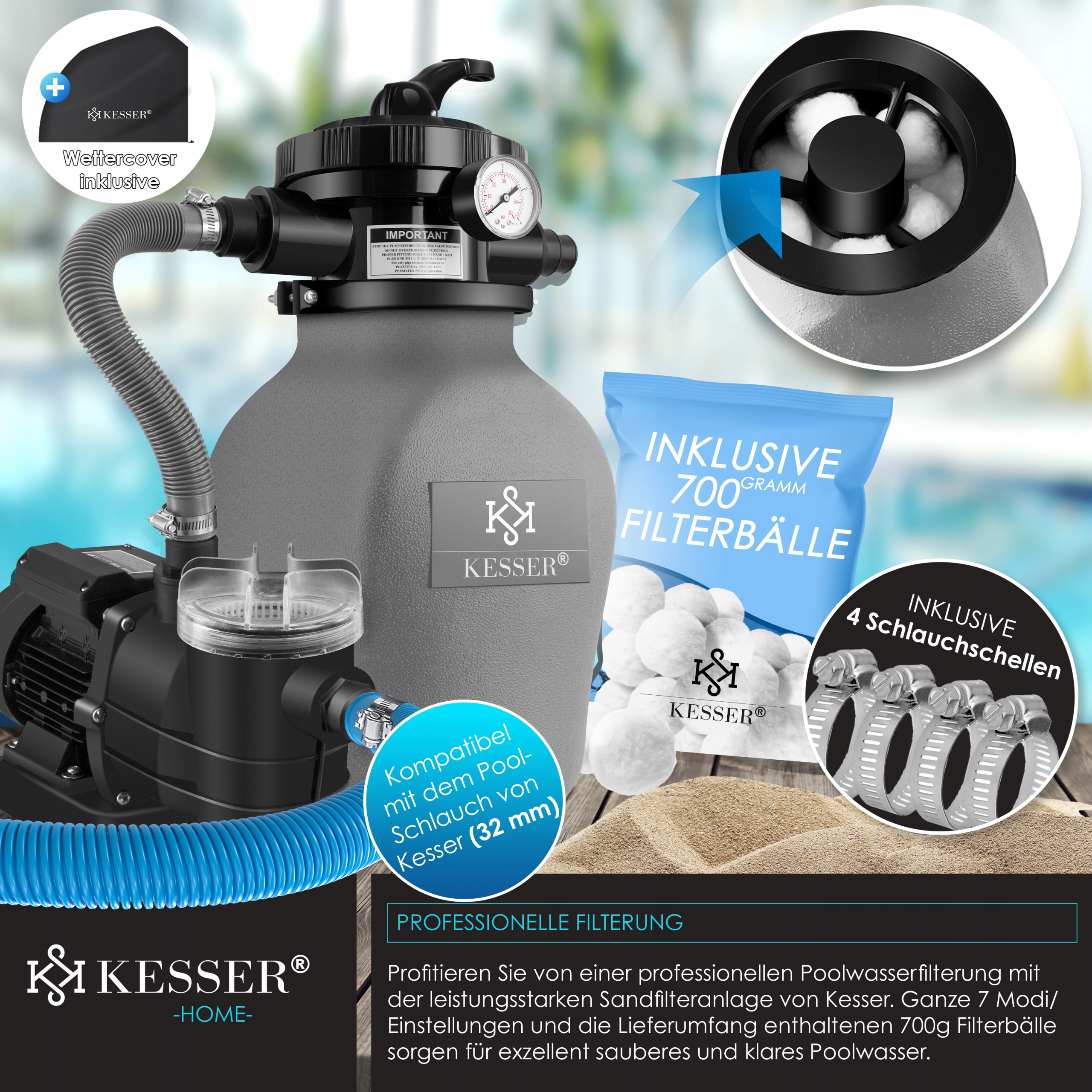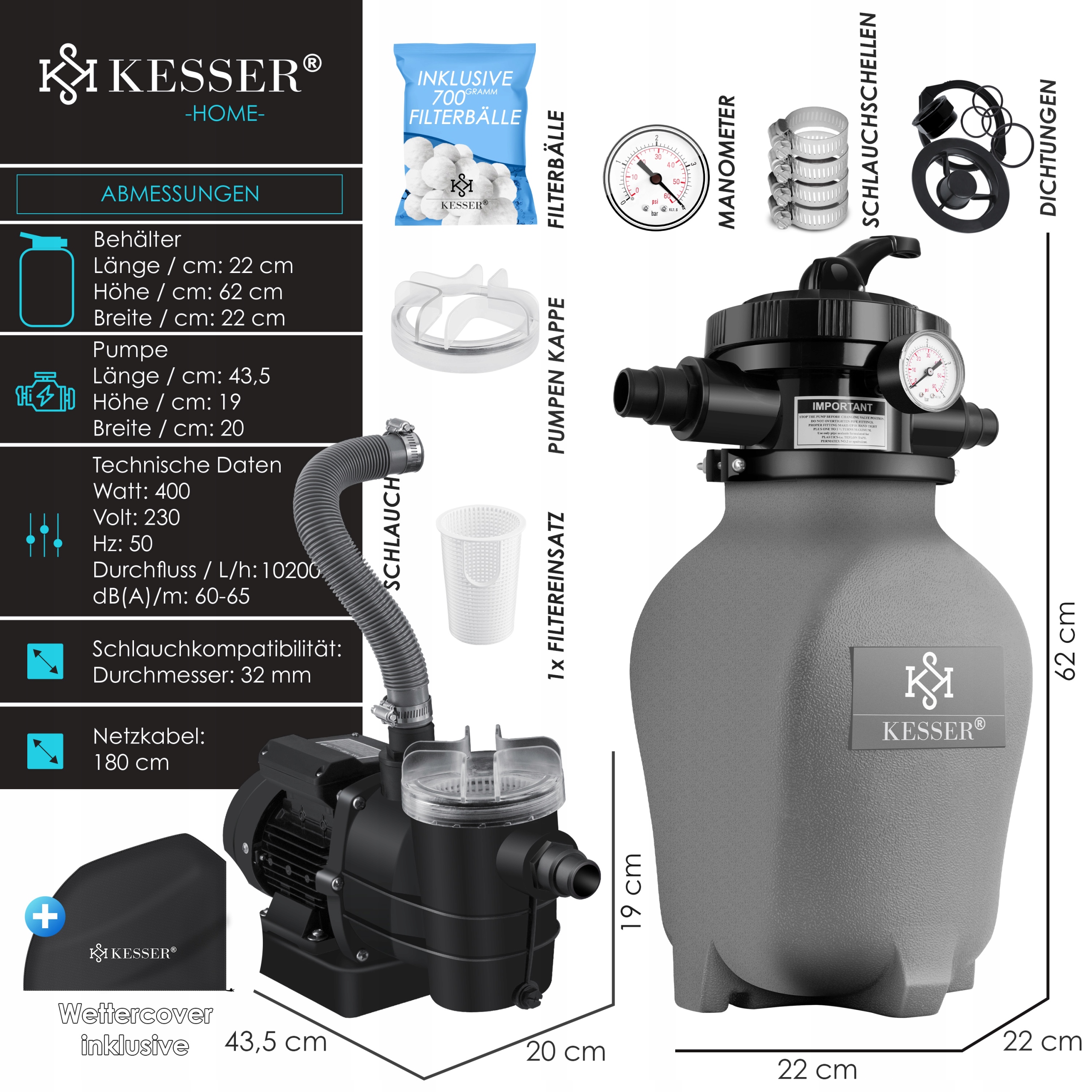 Система фільтрів піску Kesser, що покриває фільтрувальні кульки з масою 700 г для професійної фільтрації води в басейні, забезпечуючи ідеально чисту та прозору воду, низький рівень шуму, і в той же час міцний з потужністю 400 Вт, забезпечуючи ідеальний потік 9960 л/год
