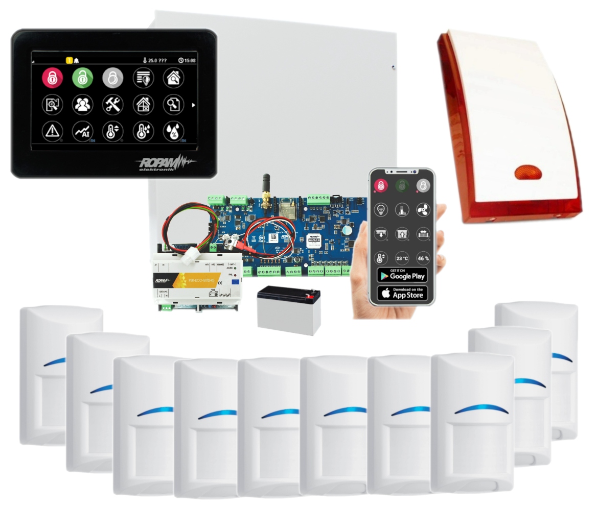 Сигналізаційний пульт Ropam Neo-IP-64-SET з WiFi модулем, що включає сенсорну панель (чорного кольору), 10 сповіщувачів Bosch та сигнальну сирену