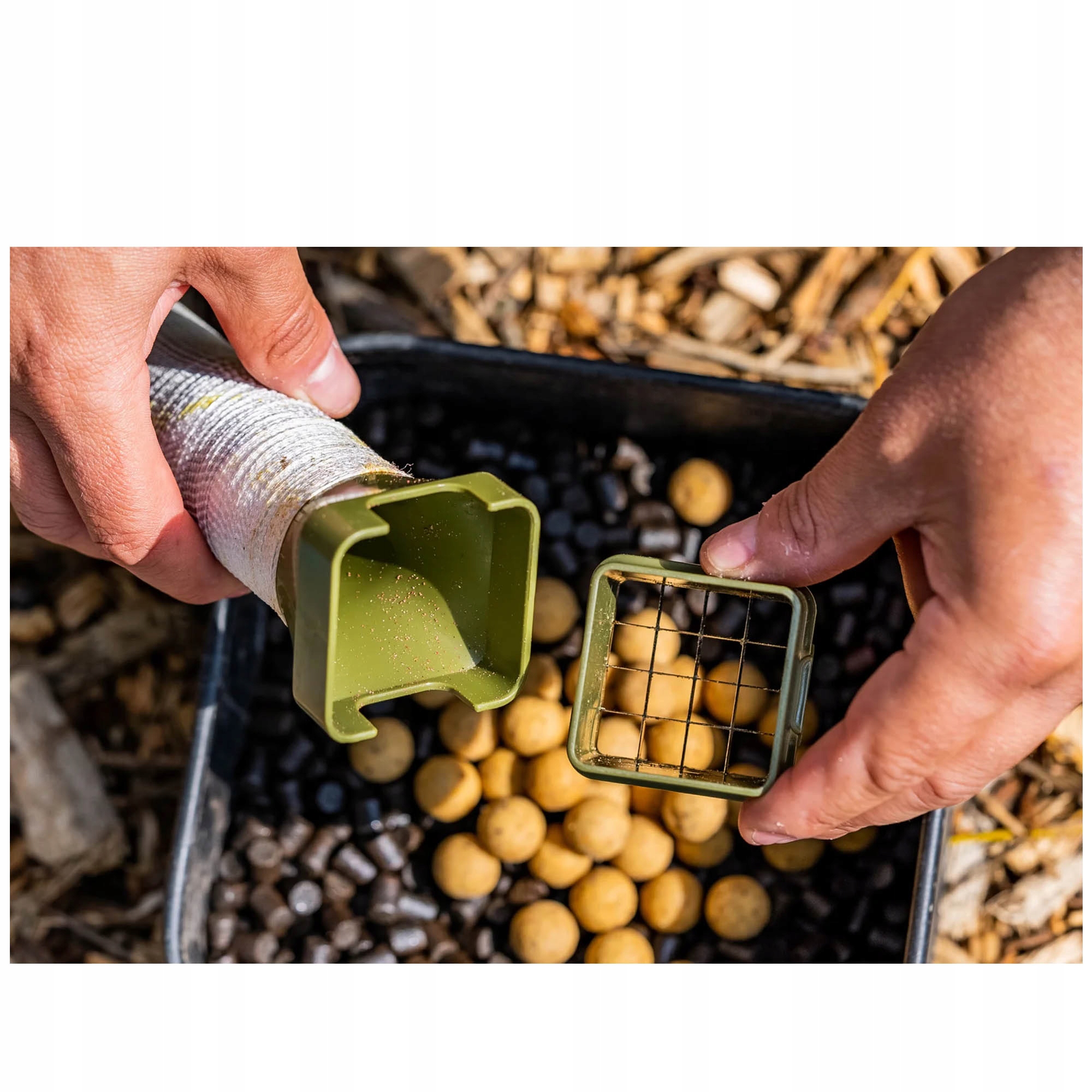 Fade Chopstix -це інноваційна, двофункціональна система PVA, яка дозволяє готувати класичні пакети або наклейки PVA, і завдяки унікальній, знімній різій коробці з кришкою дозволяє миттєво рубати білкові кульки, обідні м'ясо, тигрові горіхи та інші приманки безпосередньо в сітці PVA. Просто додайте гранули, наземні або невеликі дроби, щоб створити надзвичайно привабливий набір приманки.
