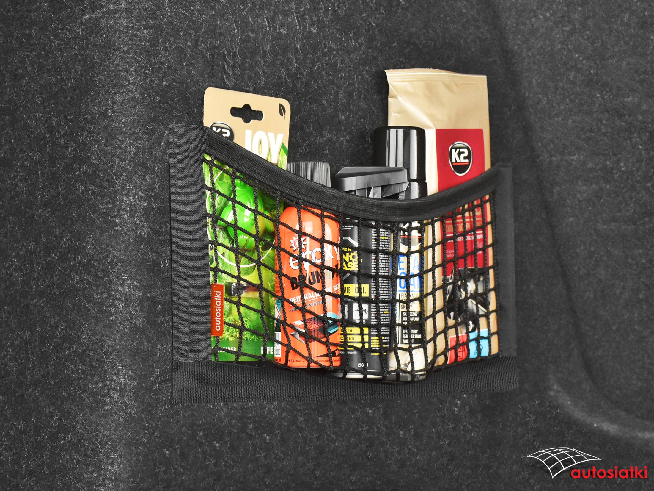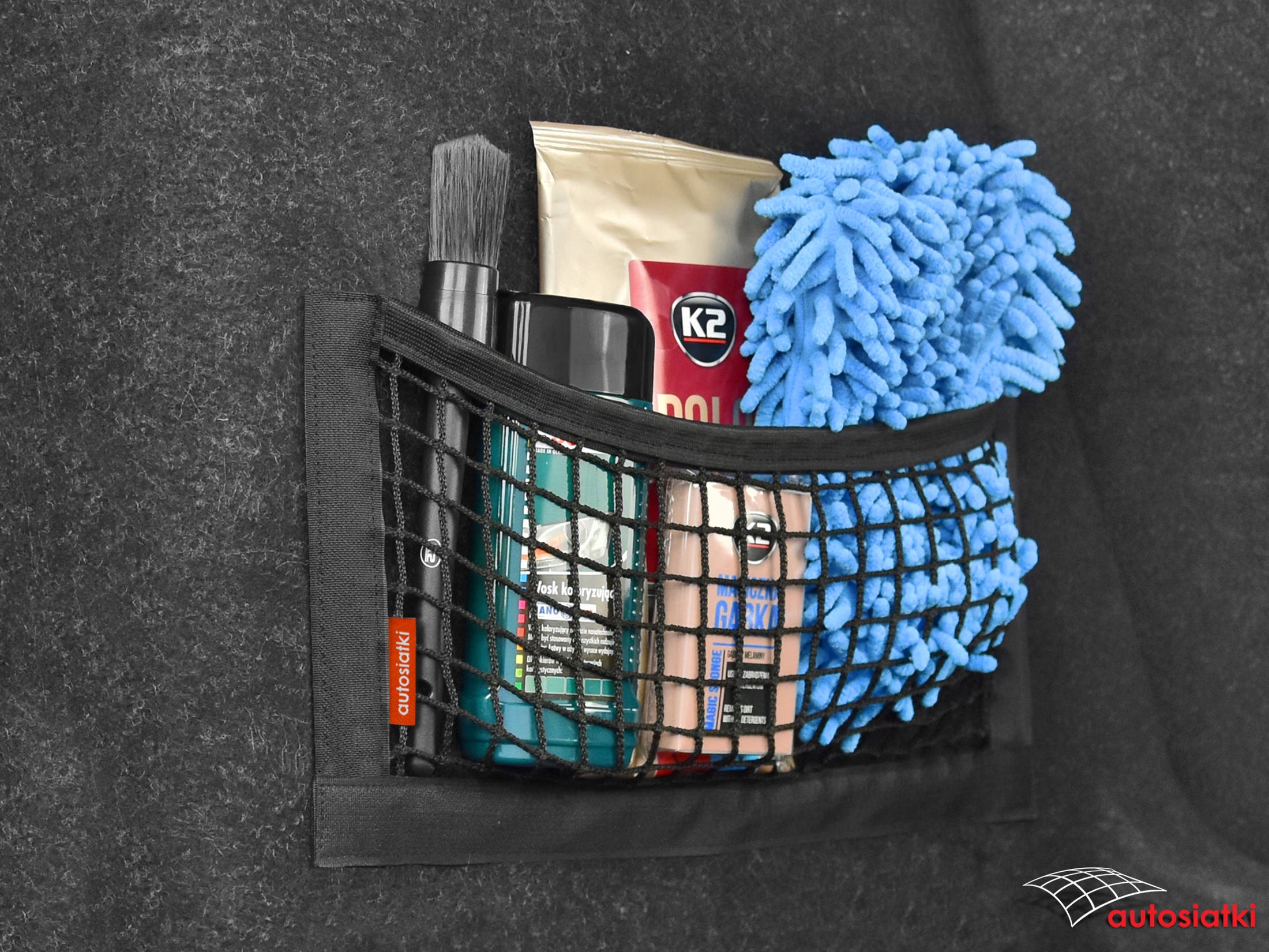 Це міцна сітка, покрита липучкою знизу та з боків. Зверху покрито гумою, яка фіксує та захищає аксесуари від переміщення. Кишеня кріпиться до килимка в багажнику або салоні автомобіля.