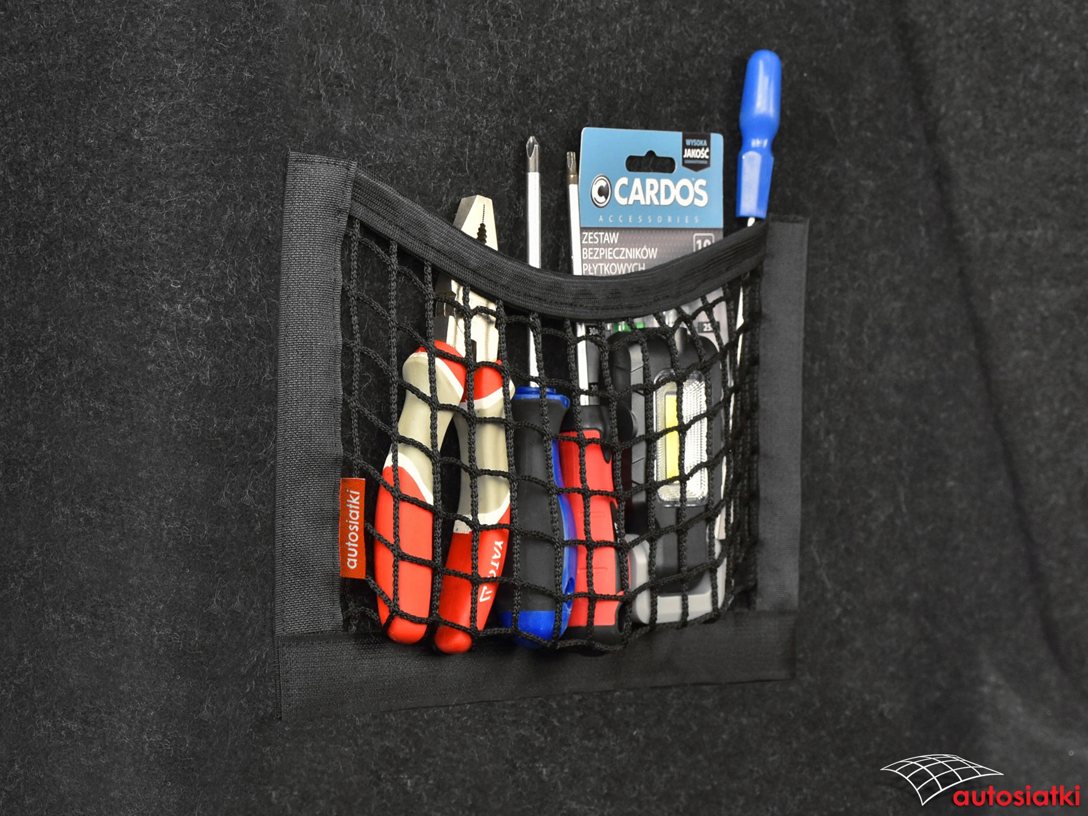 Це міцна сітка, покрита липучкою знизу та з боків. Зверху покрито гумою, яка фіксує та захищає аксесуари від переміщення. Кишеня кріпиться до килимка в багажнику або салоні автомобіля.