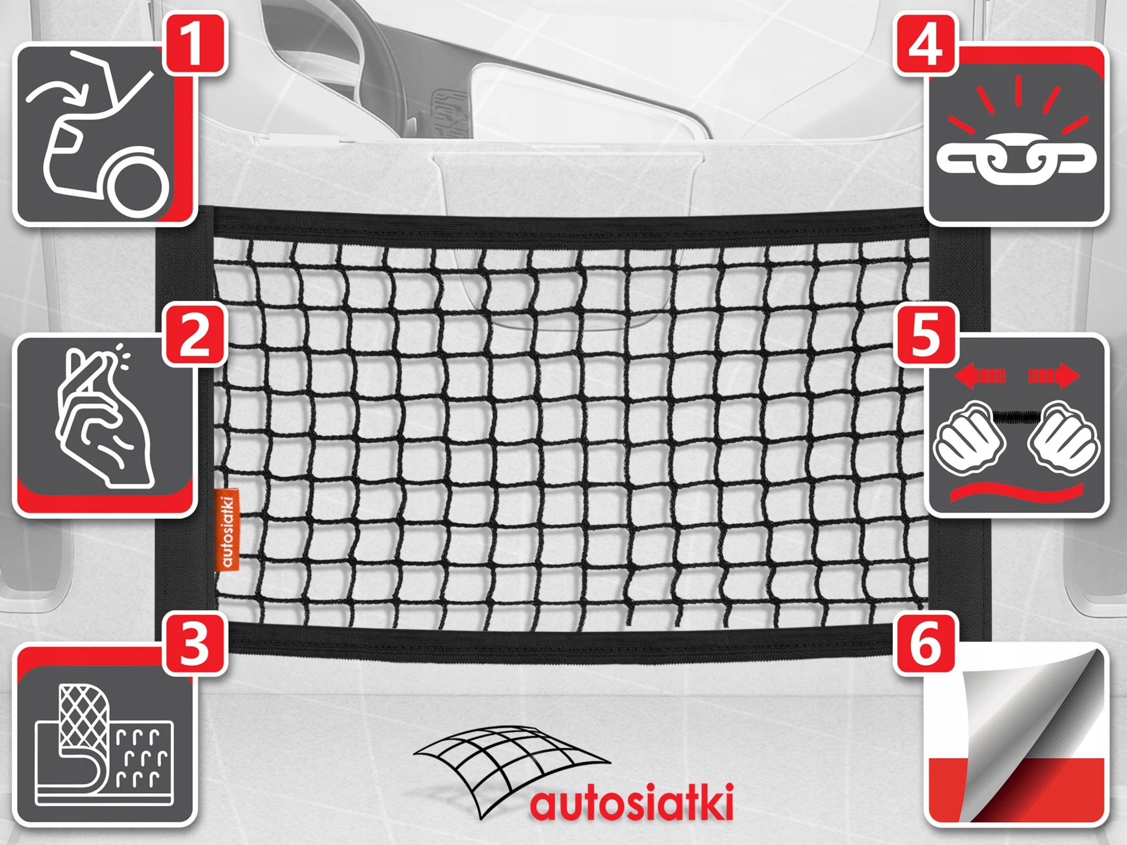 Це міцна сітка з липучками з боків. Оздоблення гнучкою гумою зверху та знизу, що дозволяє регулювати сітку відповідно до предметів, що транспортуються. Огорожа кріпиться до килимка в багажнику або салоні автомобіля.
