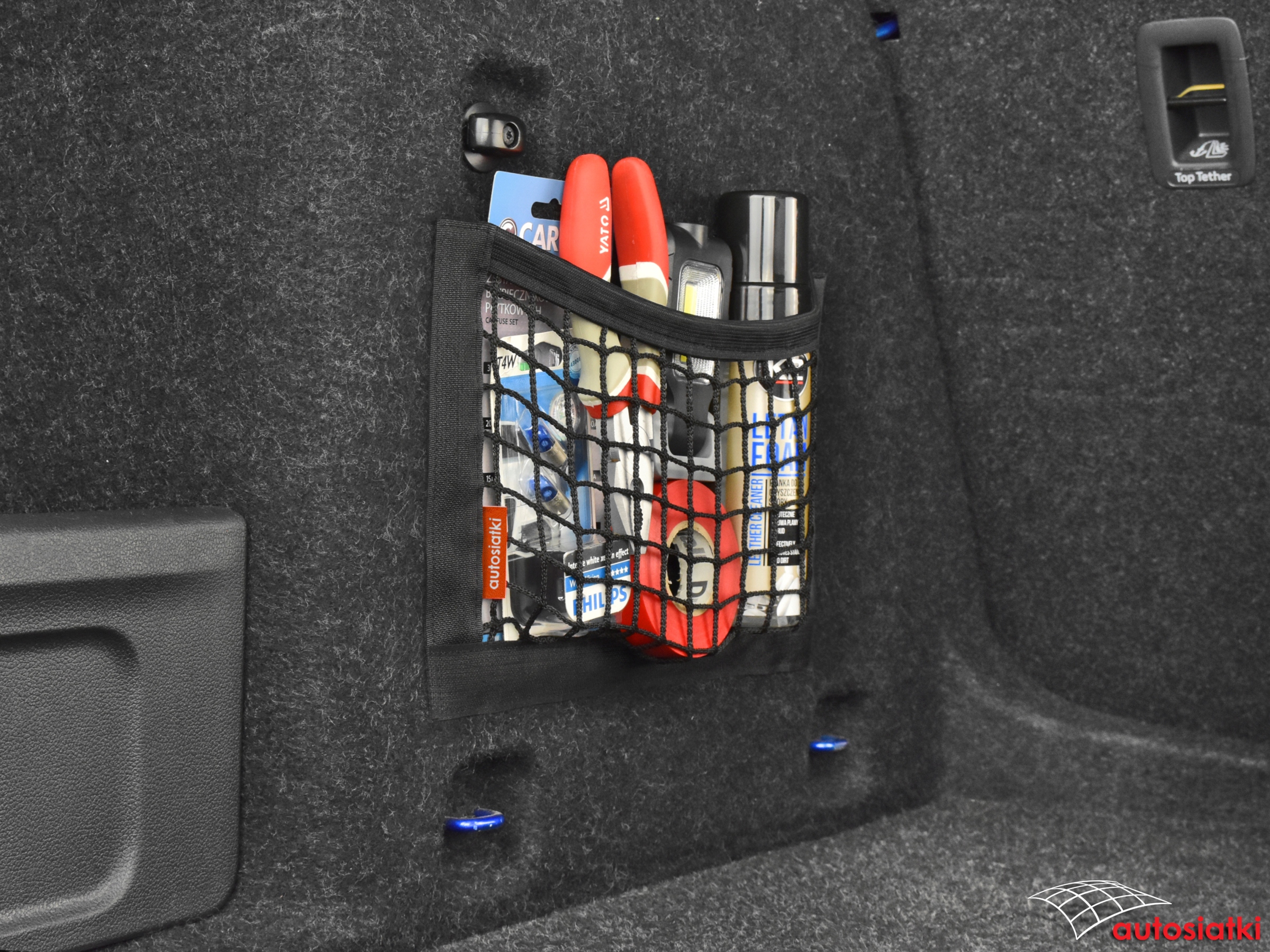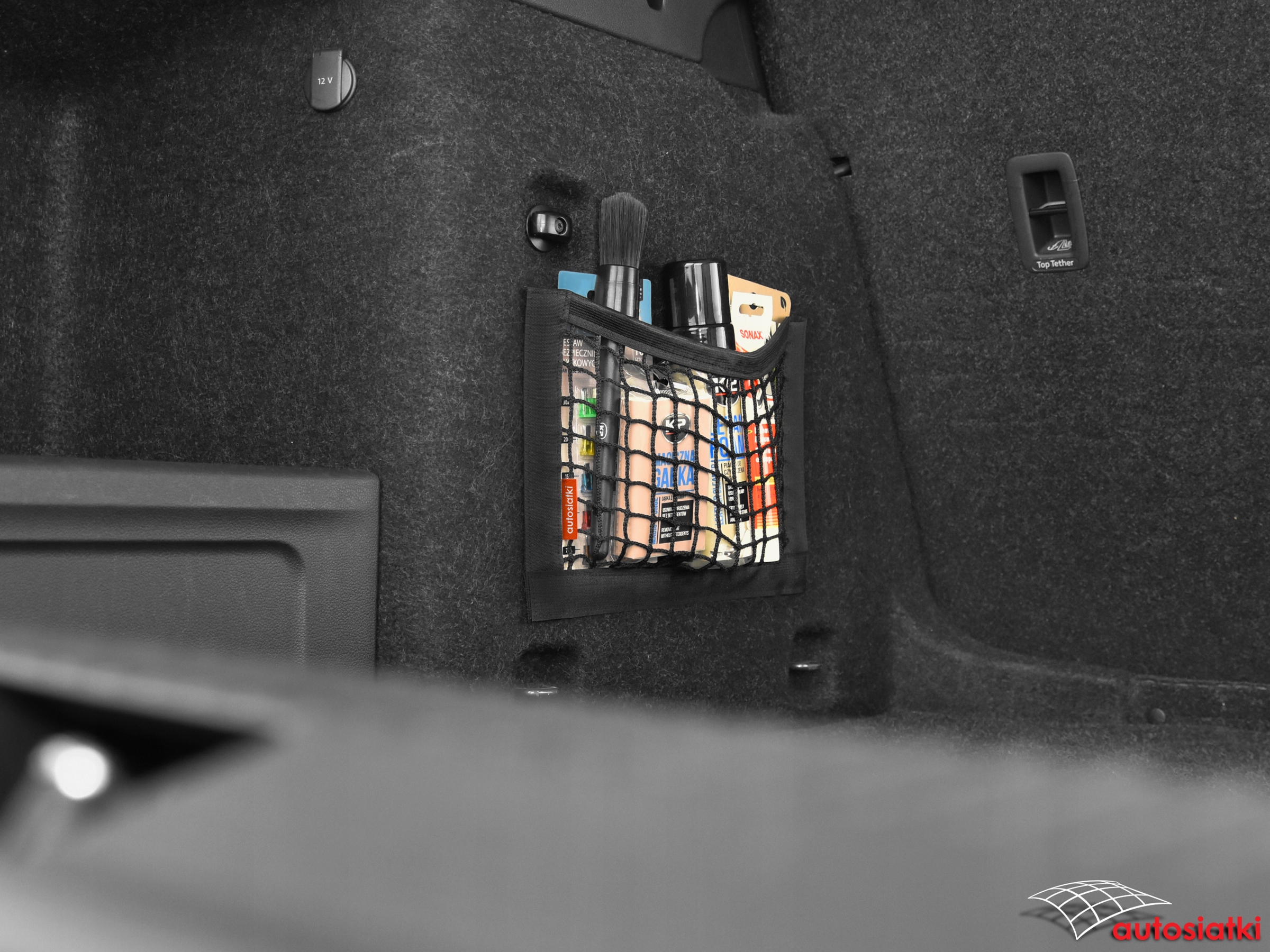 Це міцна сітка, покрита липучкою знизу та з боків. Зверху покрито гумою, яка фіксує та захищає аксесуари від переміщення. Кишеня кріпиться до килимка в багажнику або салоні автомобіля.