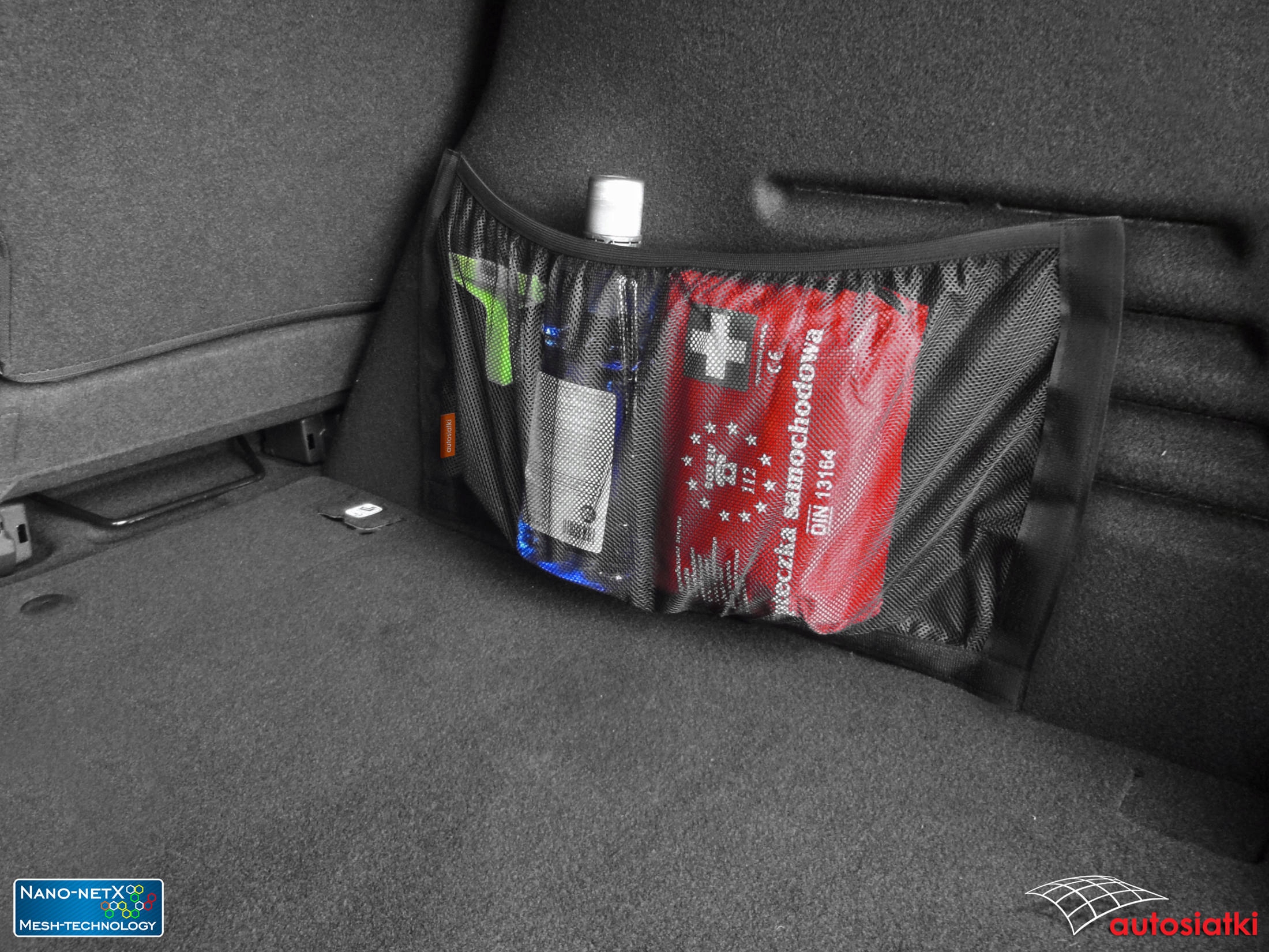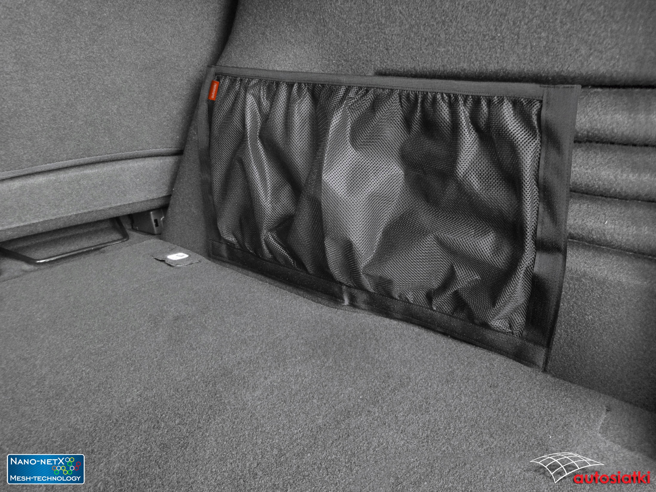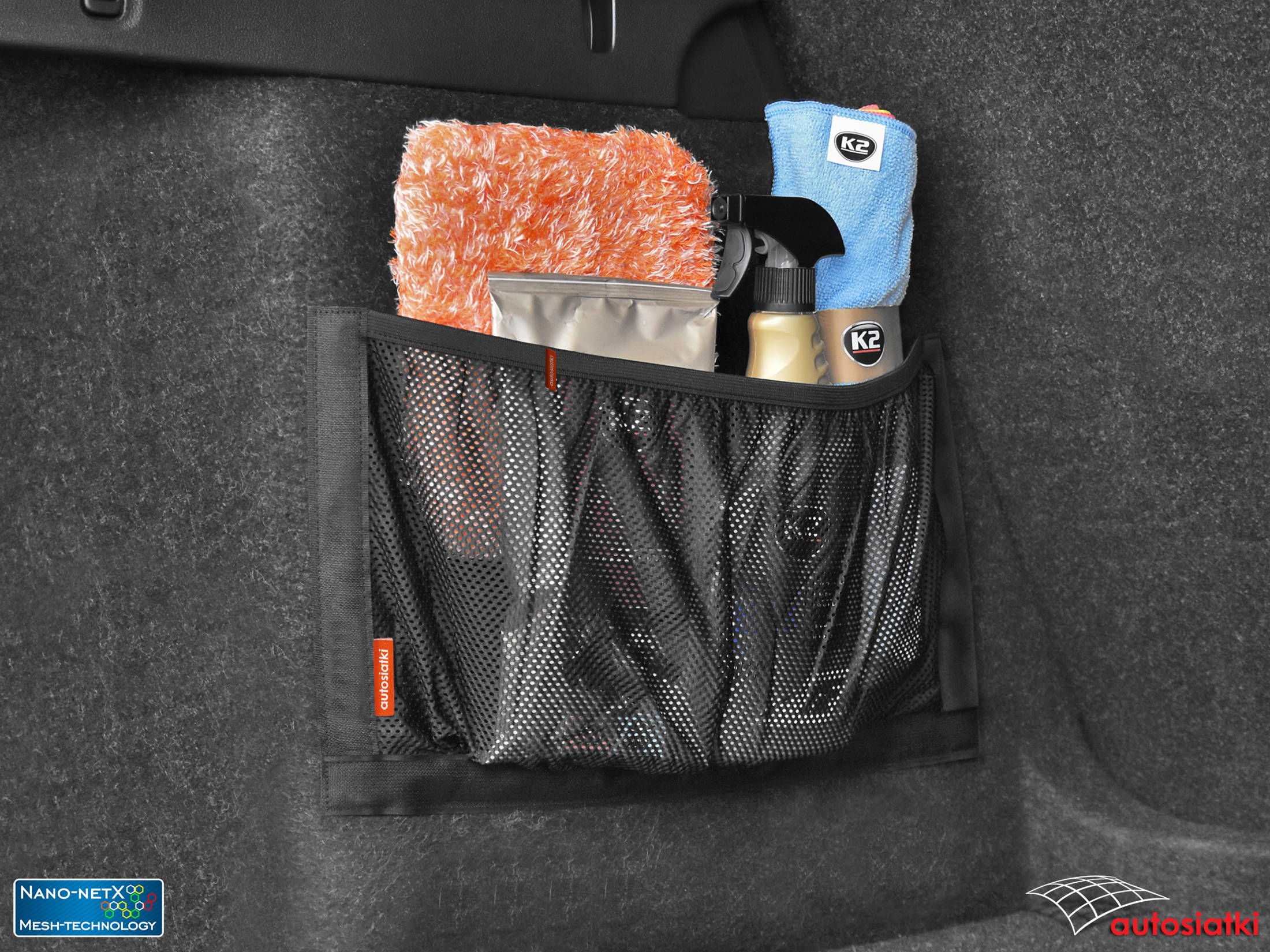 Це міцна сітка Nano-NetX, оздоблена липучкою знизу та з боків. Покритий гумою зверху для захисту аксесуарів від переміщення. Використаний матеріал Mesh-Technology захищає навіть дрібні предмети від випадання. Кишеня кріпиться на килимок в багажнику або салоні автомобіля.