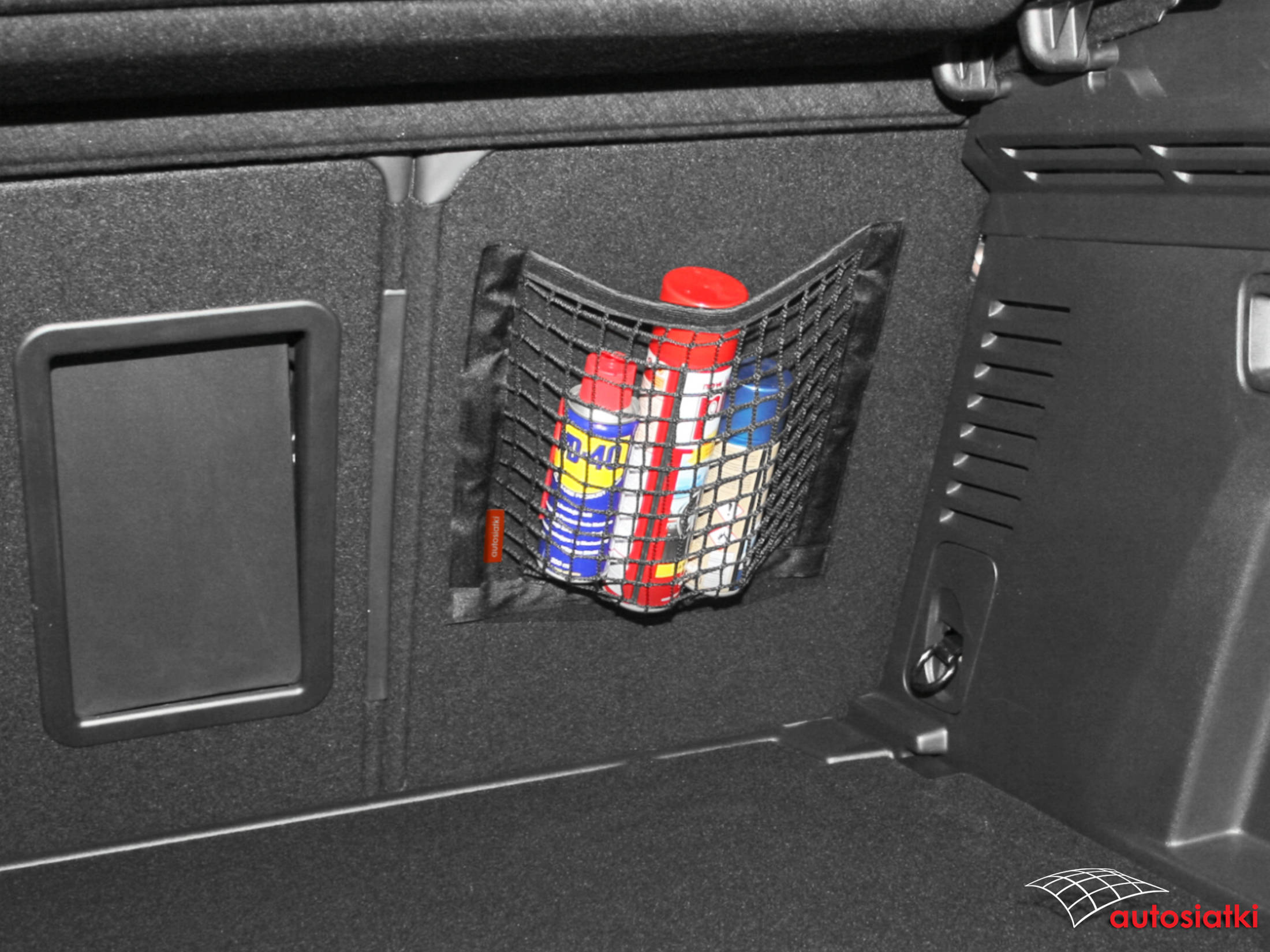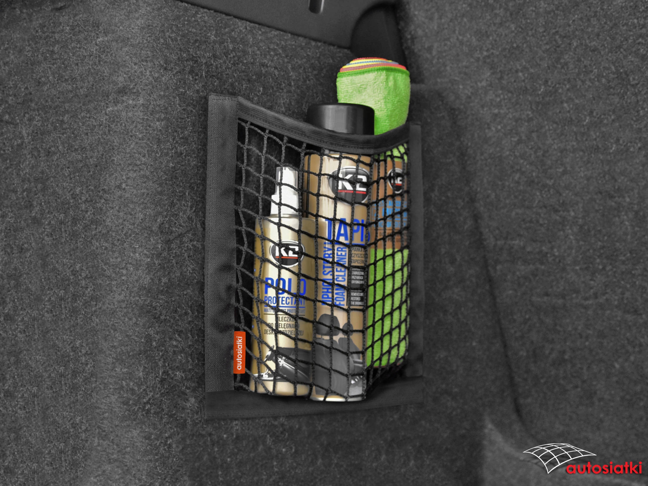 Це міцна сітка, покрита липучкою знизу та з боків. Зверху покрито гумою, яка фіксує та захищає аксесуари від переміщення. Кишеня кріпиться до килимка в багажнику або салоні автомобіля.
