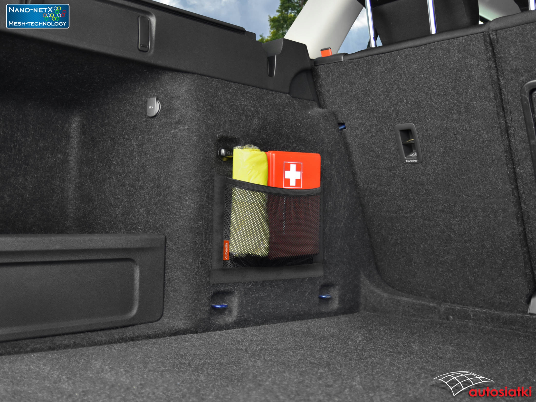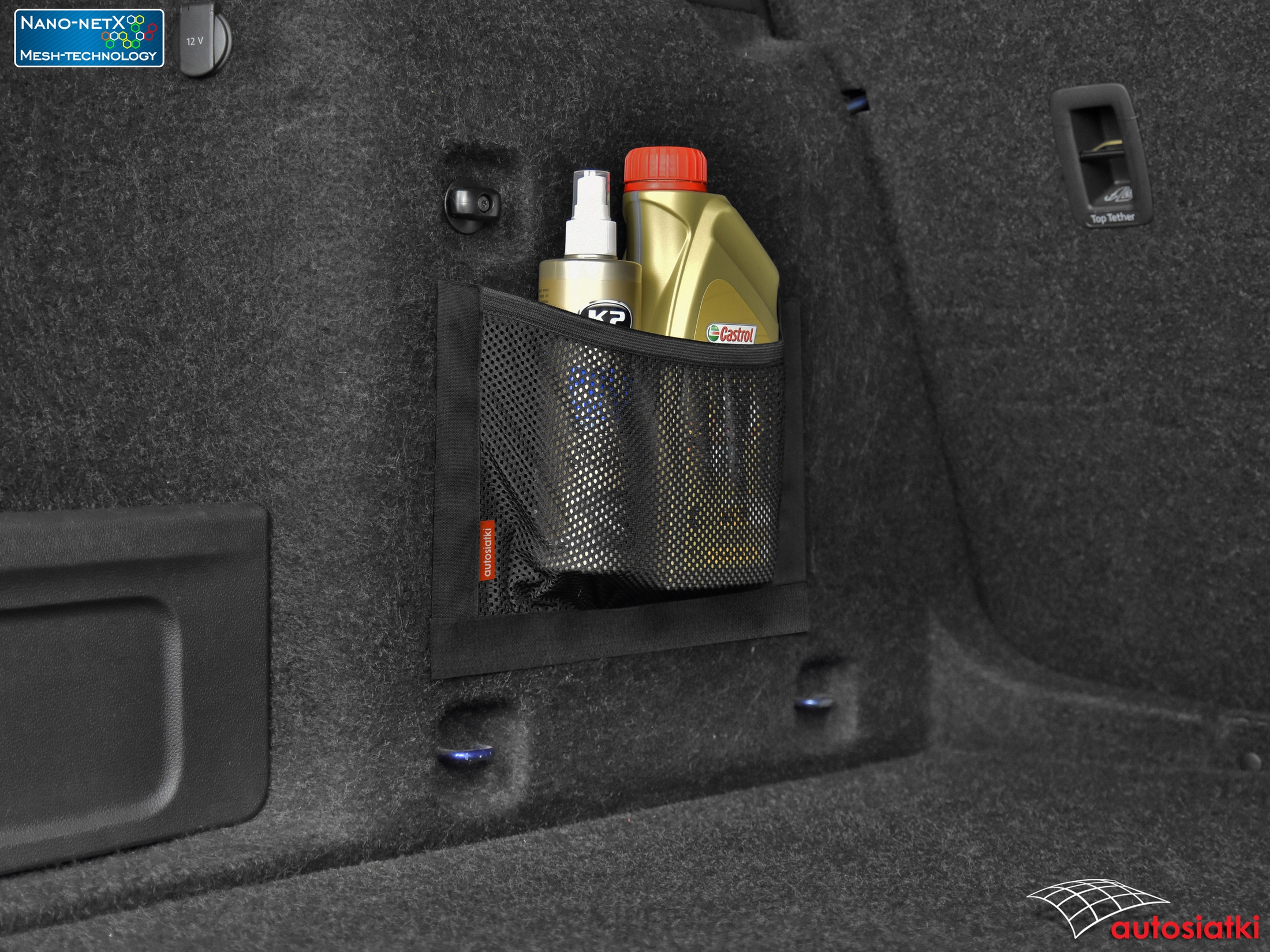 Це міцна сітка Nano-NetX, оброблена знизу та з боків міцним Стрічка Velcro b> від відомої компанії VELCRO ®. Зверху покрито гумою, яка фіксує та захищає аксесуари від переміщення. Матеріал Mesh-Technology захищає навіть дрібні предмети від випадання. Кишеня кріпиться на килимок в багажнику або салоні автомобіля. Використання стрічки VELCRO ® гарантує якісне та надійне кріплення автомобільної сітки.