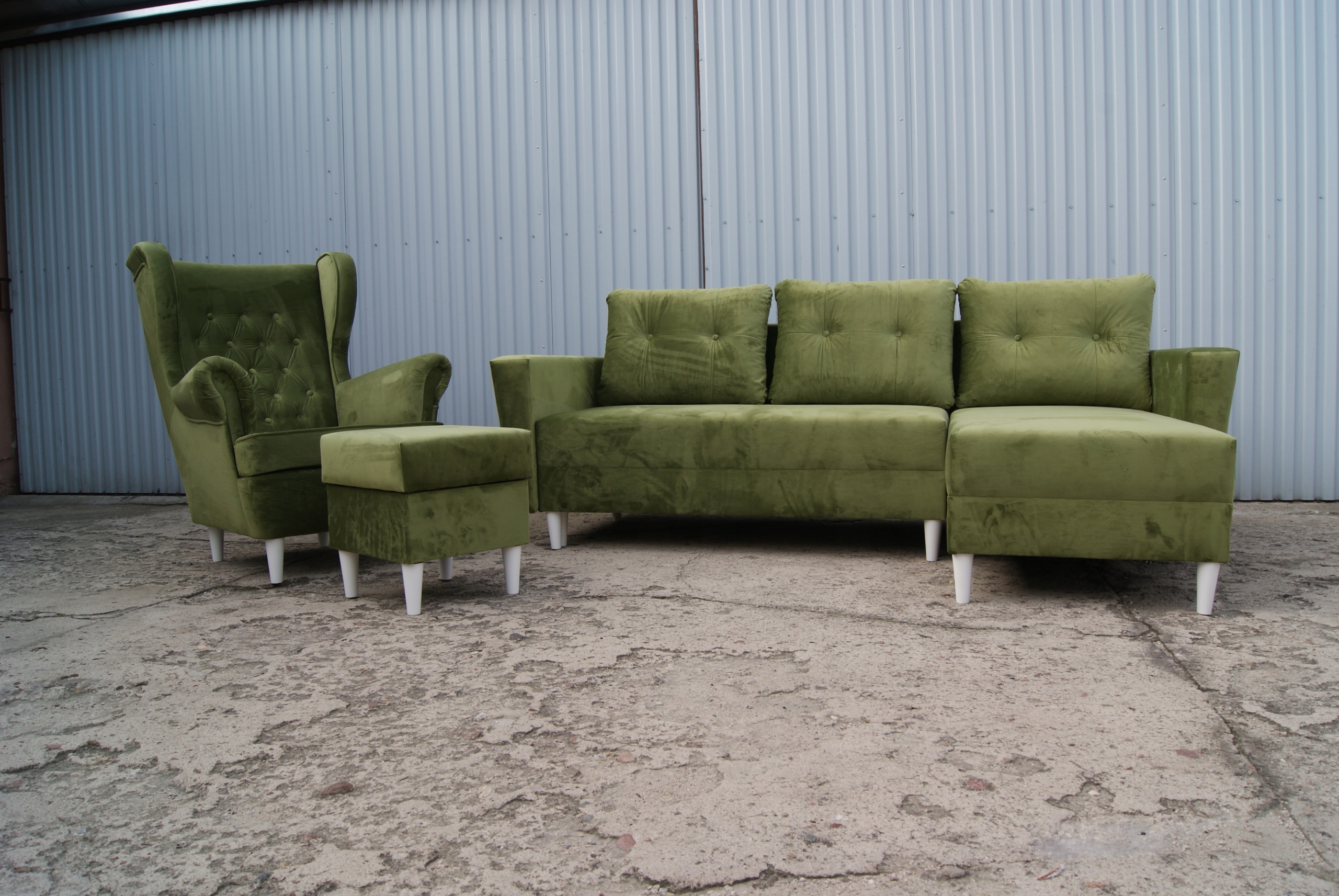 Предметом оголошення є диван кутовий: КАРЛ + КРІСЛО USZAK + ПІДНІЖКА (ПУФА) з контейнером