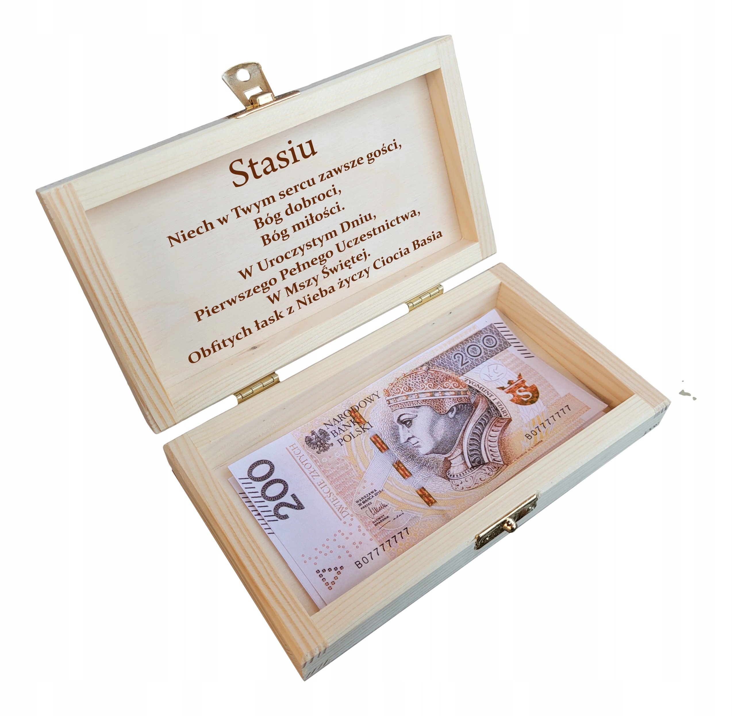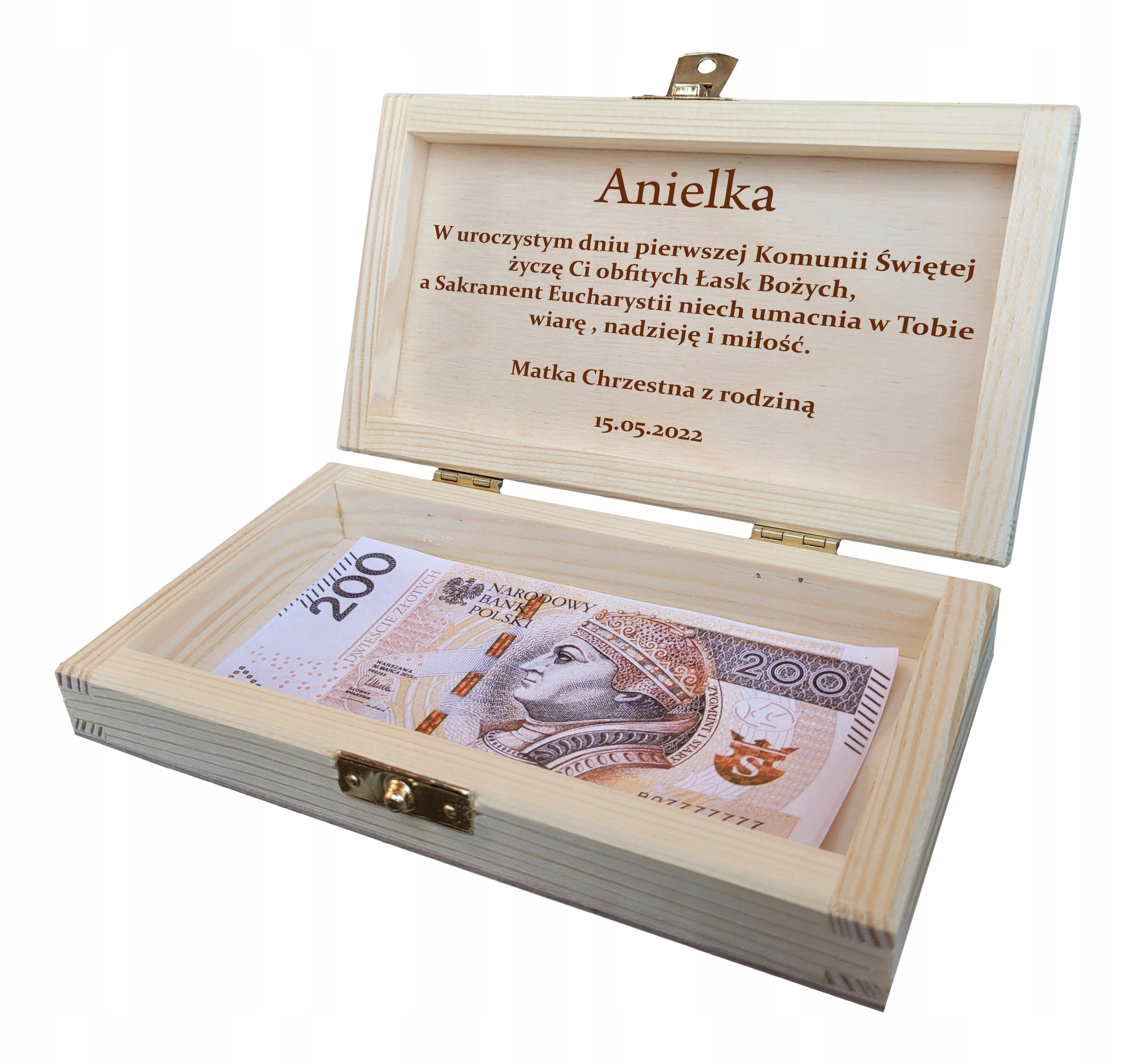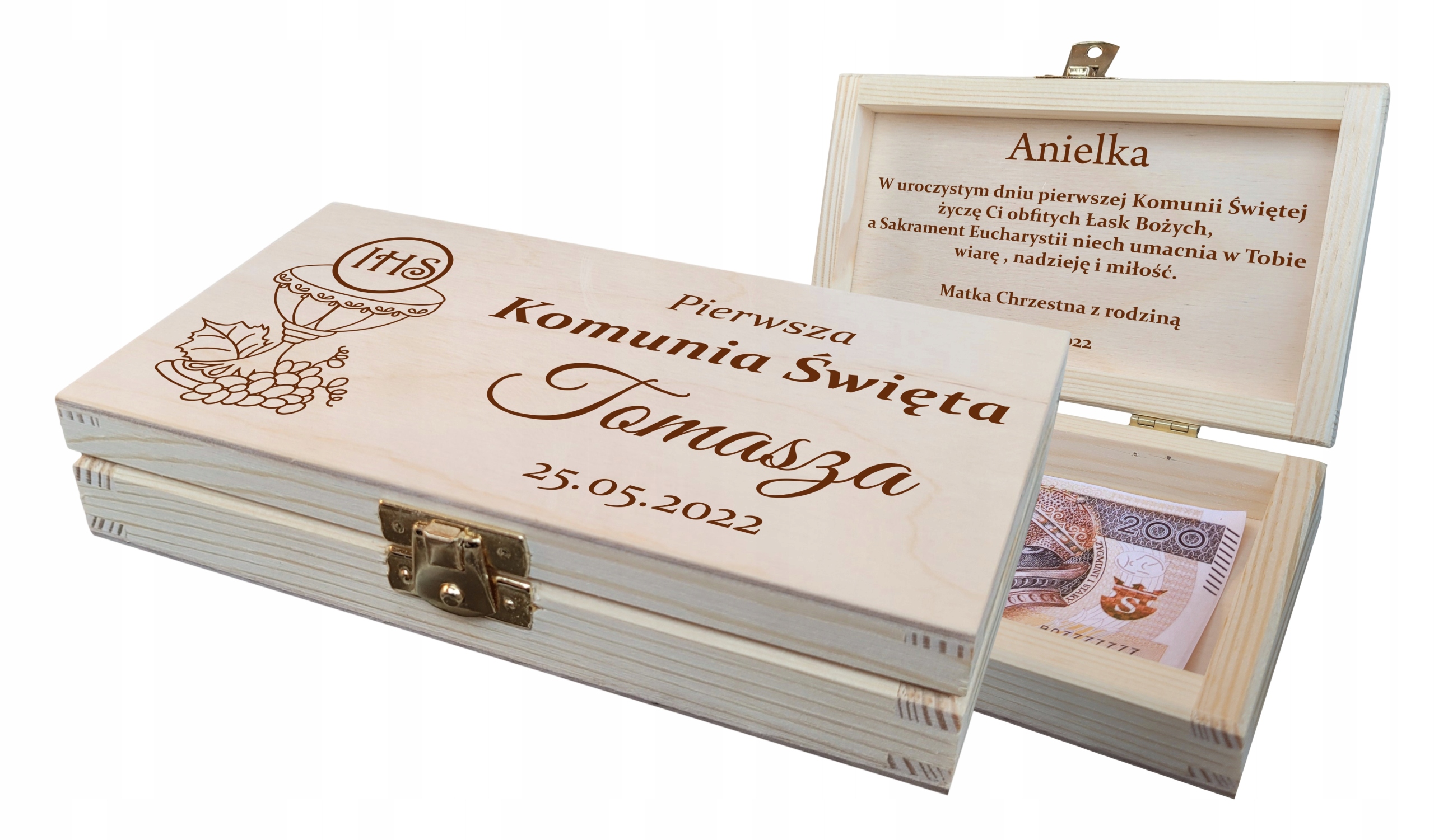 Хочете вишукано зробити подарунок у вигляді готівки? У нас є рішення для вас - скарбничка для причастя, скринька з гравіюванням - ідеальний подарунок. Подарунок 3 в 1: футляр для банкнот, побажань замість картки та коробка, яка буде сувеніром, яка може служити коробкою для дрібничок.