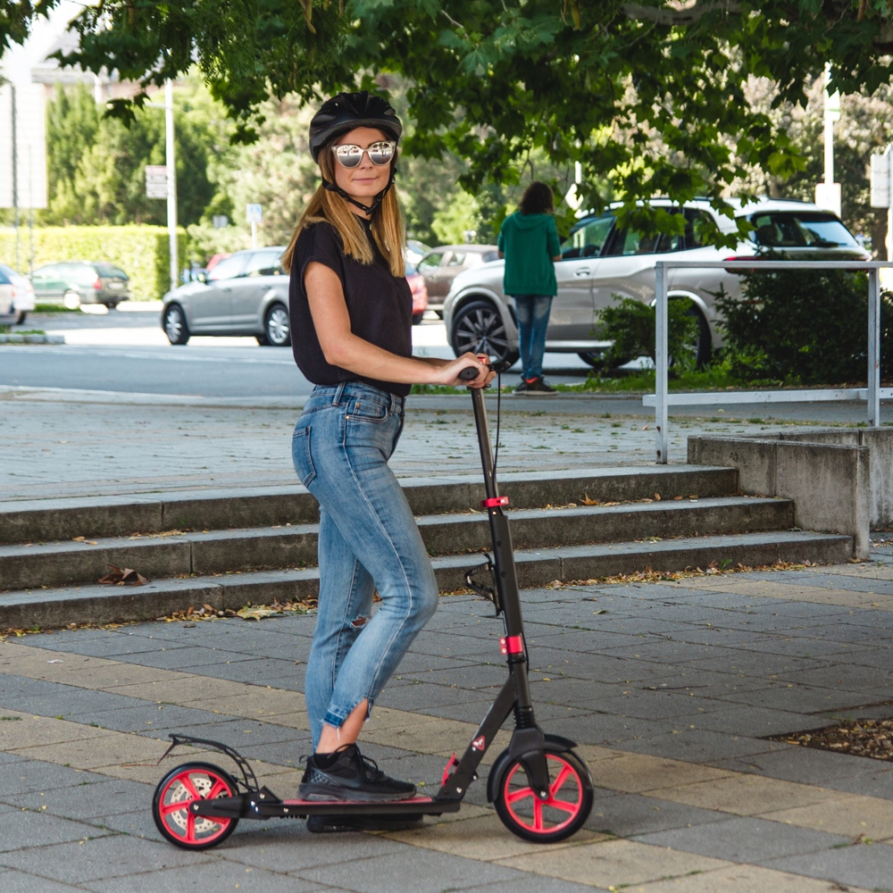 скутер для інстортної дисколи, , оснащений високим -yield дисковим гальмом на задньому колесі, виготовлений з довговічного і в той же час легкого алюмінію. Розмір підходить як для юніорів, так і для дорослих. Він оснащений інтуїтивно зрозумілим механізмом складання, який дозволяє мінімізувати скутер за допомогою керма до розміру, в якому його можна комфортно носити у вашій руці, не заважатиме громадському транспорту і акуратно вміститься в багажник автомобіля.