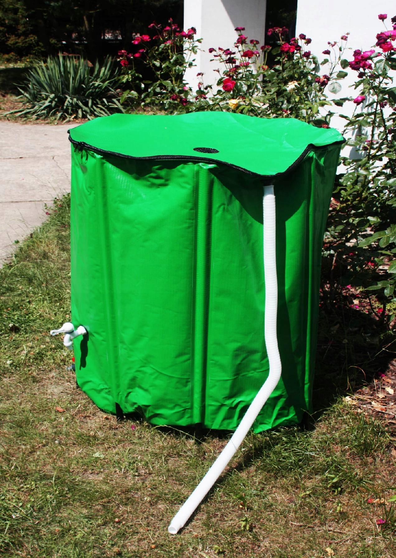 Резервуар для води Bass Polska дозволяє зібрати 500 літрів дощової води з ринви. Зібрану воду можна відбирати двома способами. Просто відкрийте блискавку, щоб набрати води зверху. Ви також можете відкрутити кран із підключеним шлангом або звичайним садовим шлангом.