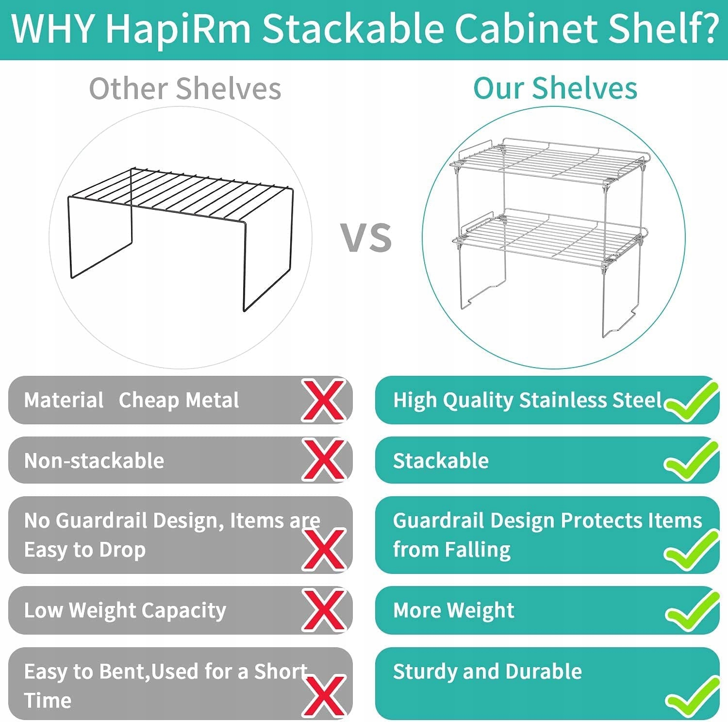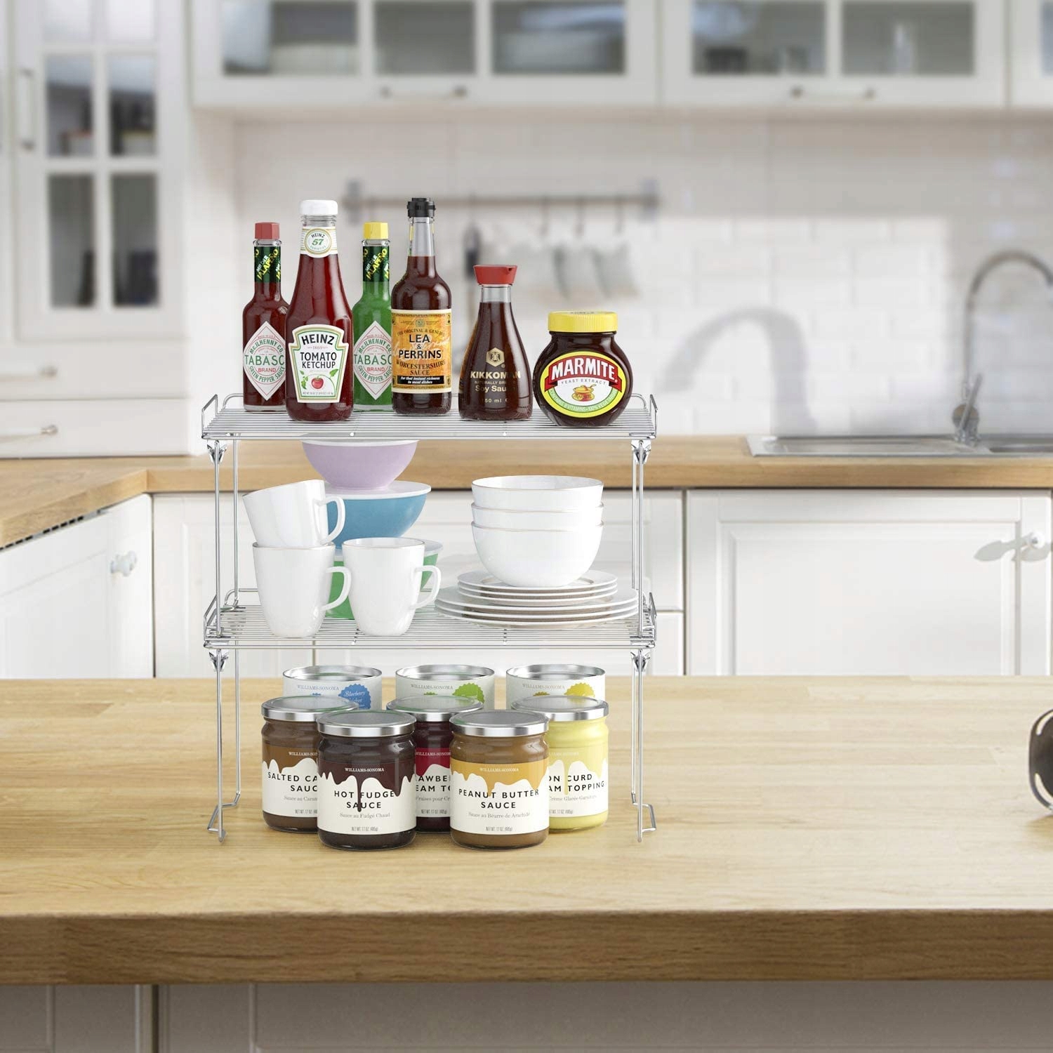 Стійкий і простий у використанні: виготовлений із міцної сталі з хромованим покриттям, висока якість використаних матеріалів гарантує, що ваша шафа-органайзер утримуватиме щоденні тарілки та їжу без складок. Без збірки, без інструментів. Ви можете розмістити ці стелажі в центрі харчової шафи або харчової комори як два рівні зберігання. Ви також можете використовувати цю підставку в шафі під раковиною