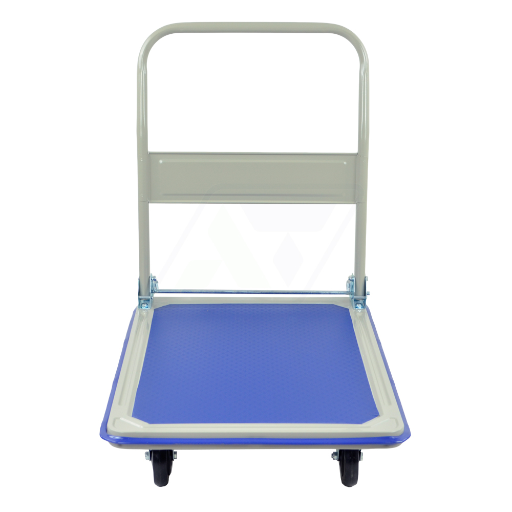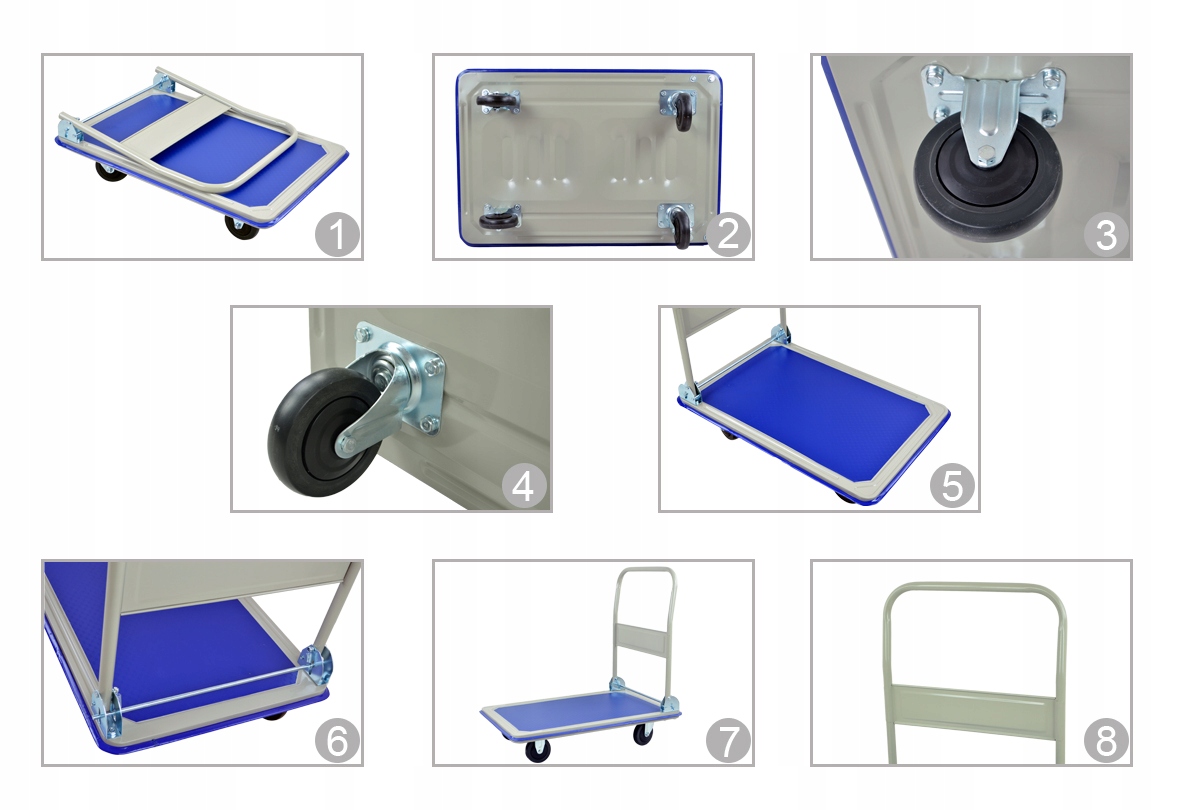 Коляска має складну ручку, яку можна скласти в будь-який момент, натиснувши ногою на пружинний замок. Задні колеса можуть повністю обертатися на 360°, щоб повністю контролювати коляску під час руху. Пристрій підвищує маневреність, особливо у вузьких складських проходах.