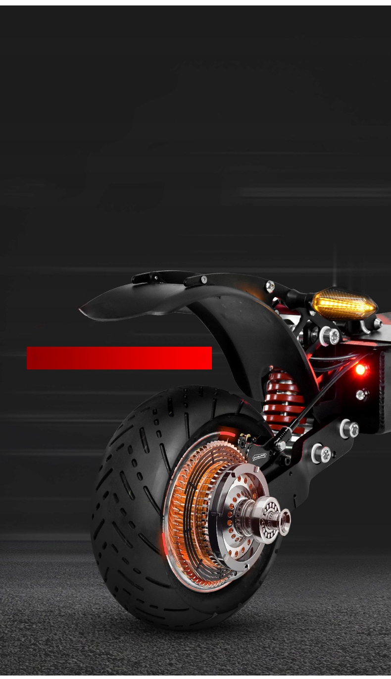 Новий вдосконалений Byued Q7PRO для дорослих оснащений потужною системою з двома двигунами, яка забезпечує 3200 Вт, літій акумулятор 52 V 19 AH та максимальна швидкість 70 км/год. Q7 Pro може мати діапазон до 60-70 км і оснащений 10-дюймовими дорожніми шинами гідравлічними дисковими гальмами та вдосконаленими функціями безпеки та стабільності. 4