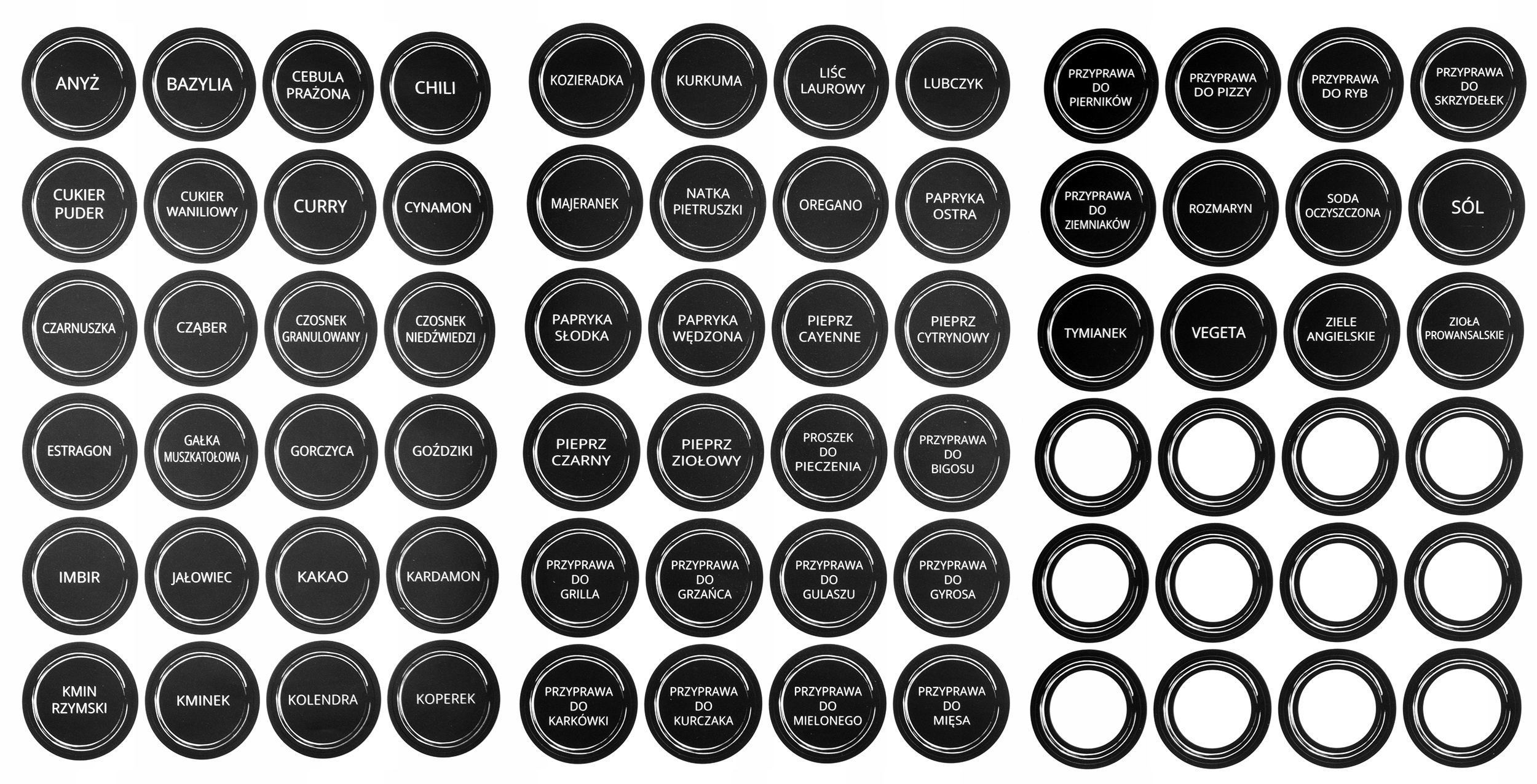 Баночки також містять наклейки. 60 наклейок описуються польськими назвами спецій, а решта 12 наклейок порожні для власного маркування.