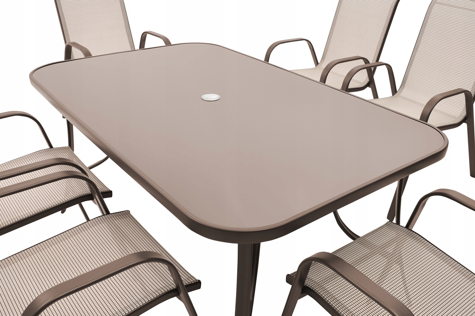 Скляний стіл ідеально підходить для вашого саду. Рама має подвійне порошкове покриття, що робить цей виріб ідеальним як для внутрішнього, так і зовнішнього використання. Використані матеріали не вимагають частого догляду, стійкі до погодних умов і не потребують спеціальних засобів догляду. Ніжки додатково оснащені пластиковими накладками. Стіл зі стільницею з коричневого загартованого скла. 5 мм, з отвором для садової парасольки.
