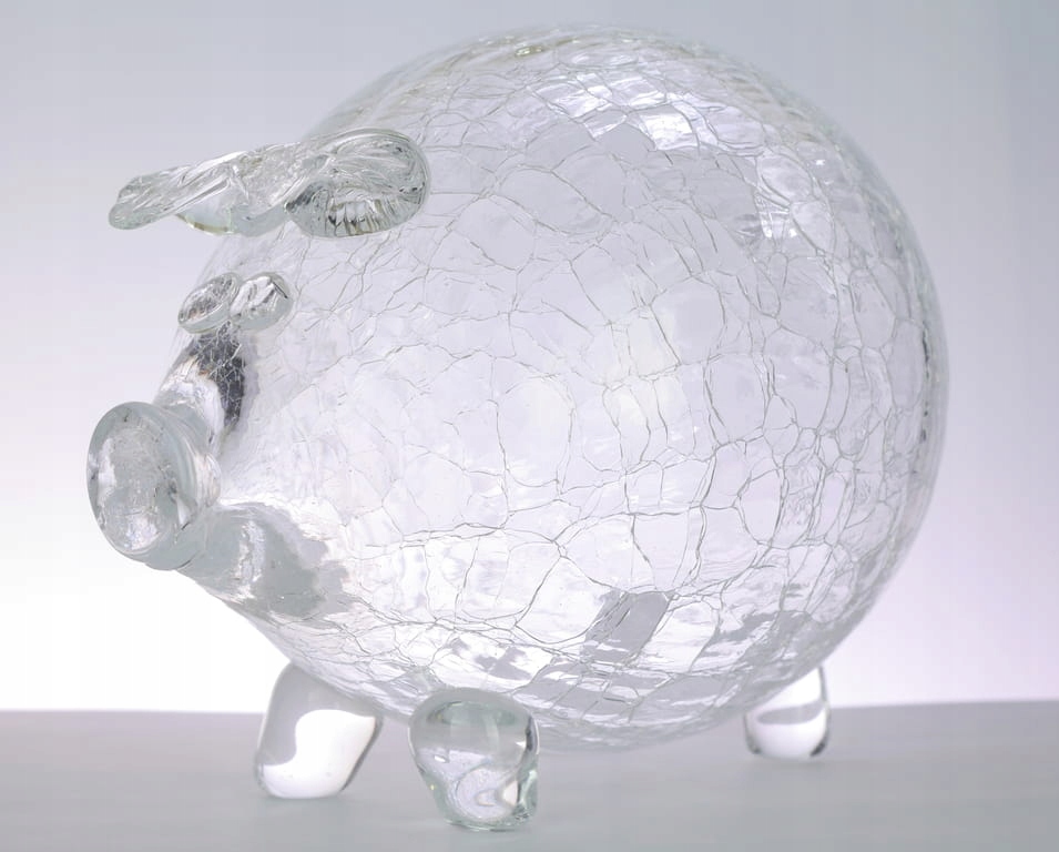 Чудова на вигляд структура скляної поверхні, яка створює враження "застиглої". Виготовлена з товстого скла, блискуча скляна поверхня. Польський продукт. Свинка має отвір - проріз зверху для вставляти монети Єдиний спосіб вийняти дрібні речі - зламати.