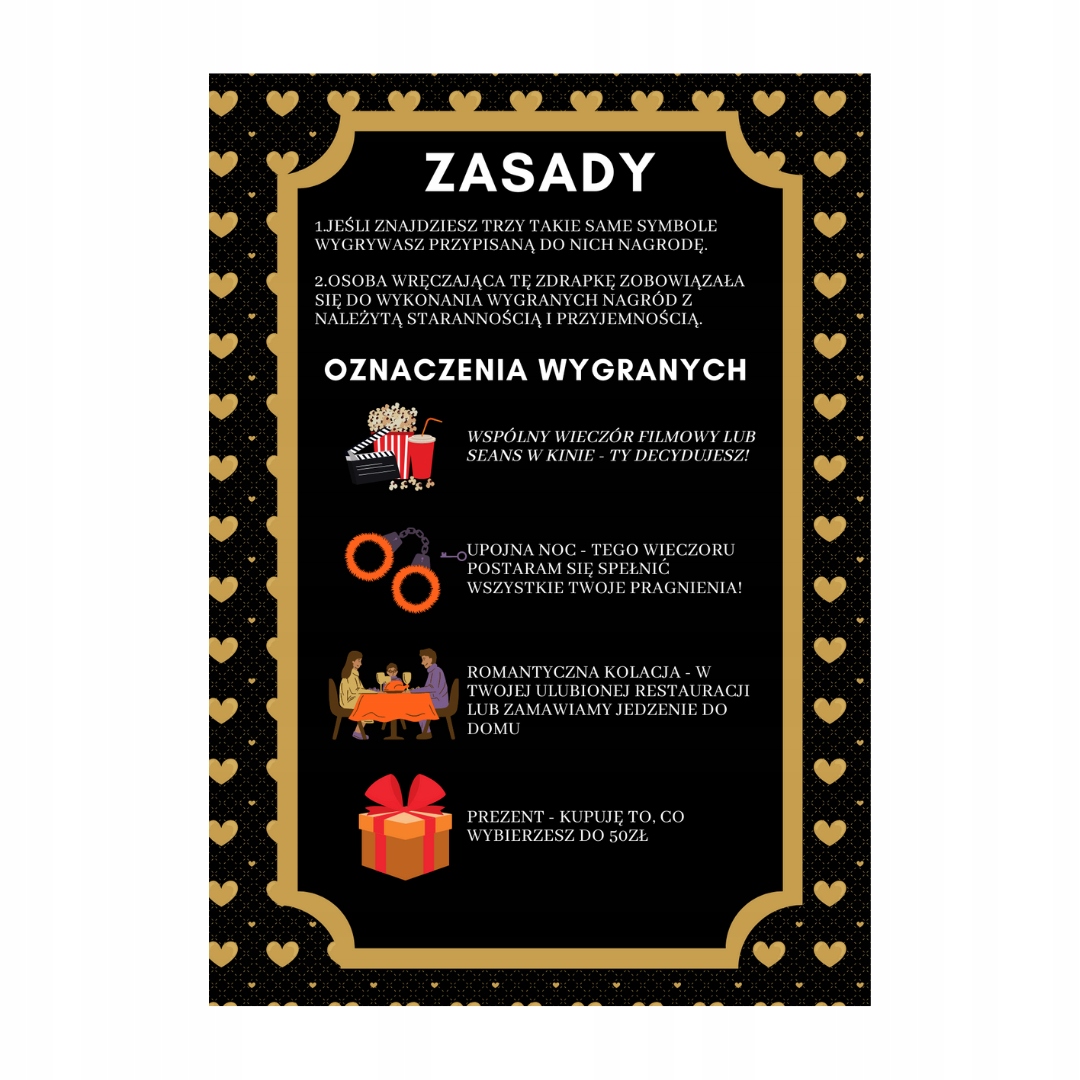 День Святого Валентина – особливе свято, сповнене любові та романтики. Якщо ви шукаєте оригінальний подарунок для коханої людини, наша скретч-картка стане ідеальним рішенням. Це не тільки маленький подарунок, але й чудове доповнення до великого подарунка. Купуючи наш купон, ви даєте своїй другій половинці шанс виграти - і це може виявитися справді незабутнім сюрпризом. Під 6 місцями приховано позначки, а збір 3 однакових полів гарантує виграш (у цьому купоні особа, яка отримує подарунок, виграє п’яну ніч).