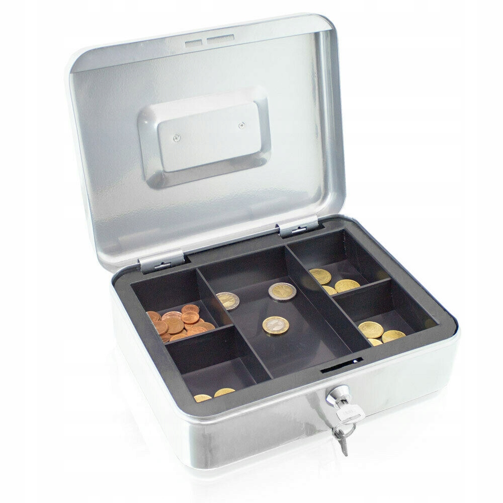 Сірий касовий ящик - гарне рішення для транспортування грошей і сезонних робіт, наприклад, як касовий апарат або гаманець. Оснащений міцним циліндричним замком, який ефективно захищає вміст від несанкціонованого доступу. Має додатковий вкладиш для монет ЄВРО. Сейф впишеться в будь-яке приміщення, а його кути надійно закруглені. Ручка дозволяє швидко транспортувати, яка ховається глибоко у верхній частині кришки. Коробка пофарбована порошковою фарбою, а її вставка виготовлена з міцного пластику.