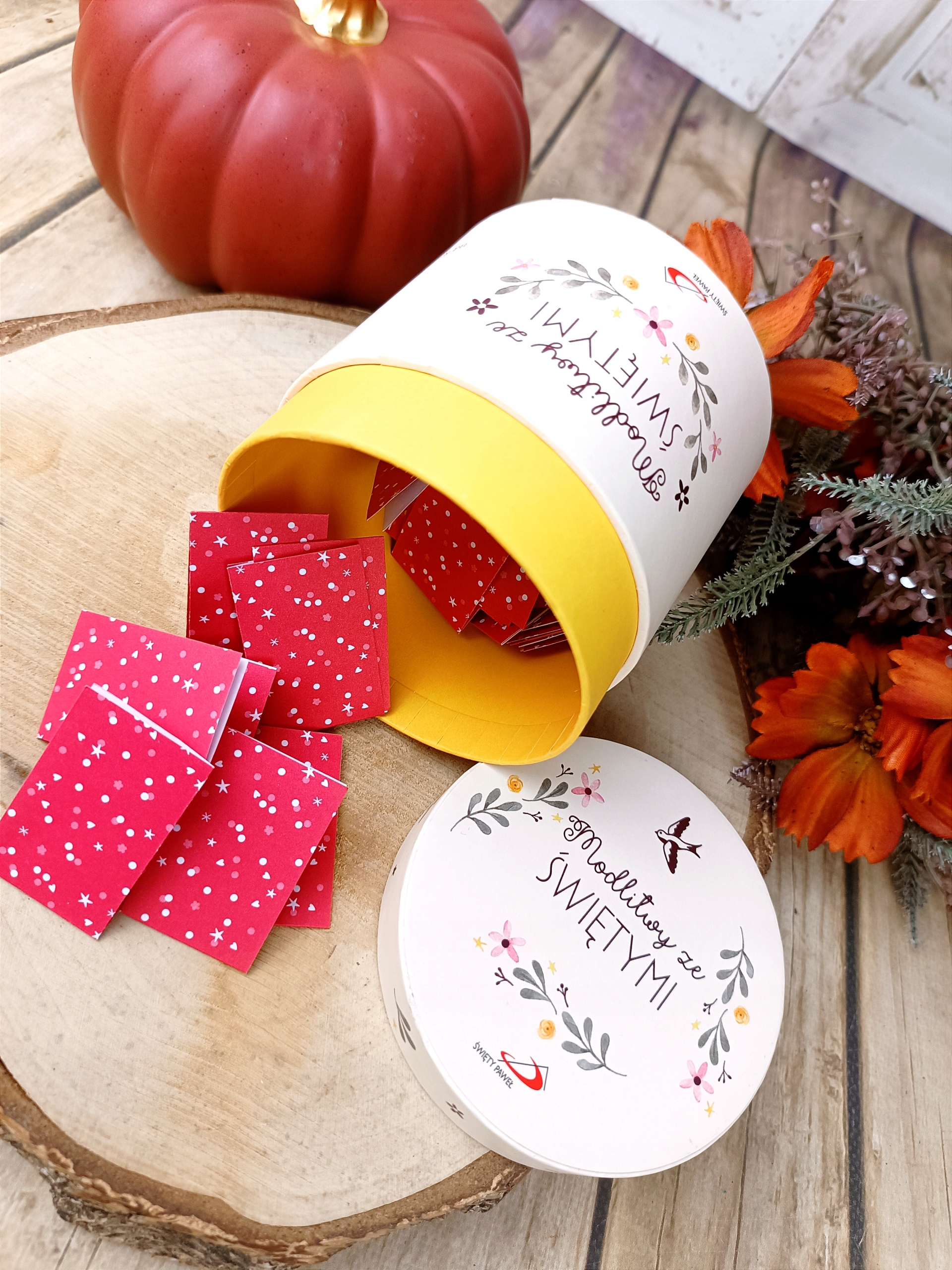 У коробці 52 двосторонні картки. З одного боку є графіка, з іншого – фрагмент Біблії та молитва з конкретним святим, зокрема: святий Франциск Ассізький, святий Ігнатій Лойола, свята Уршуля Ледоховська, блаженний Єжи Попелушко, свята Фаустина Ковальська, блаженний Карло Акутіс, святий Максиміліан Марія Кольбе та багато інших.