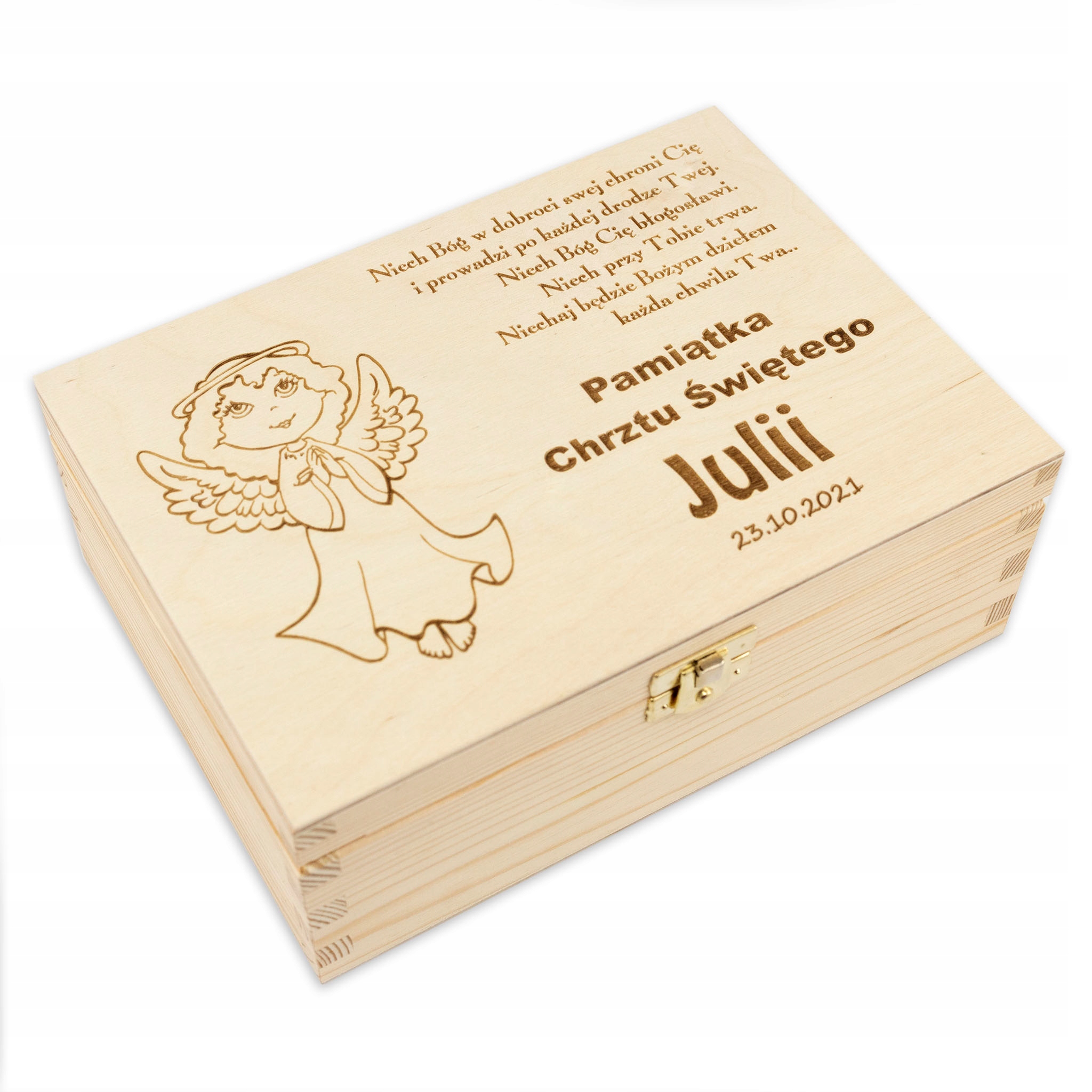 Подарунок поміщений у велику дерев’яну коробку. У коробці є необхідні аксесуари для дитини First Moments, в тому числі дерев'яні ніжки. Все це чудовий подарунок на хрещення.