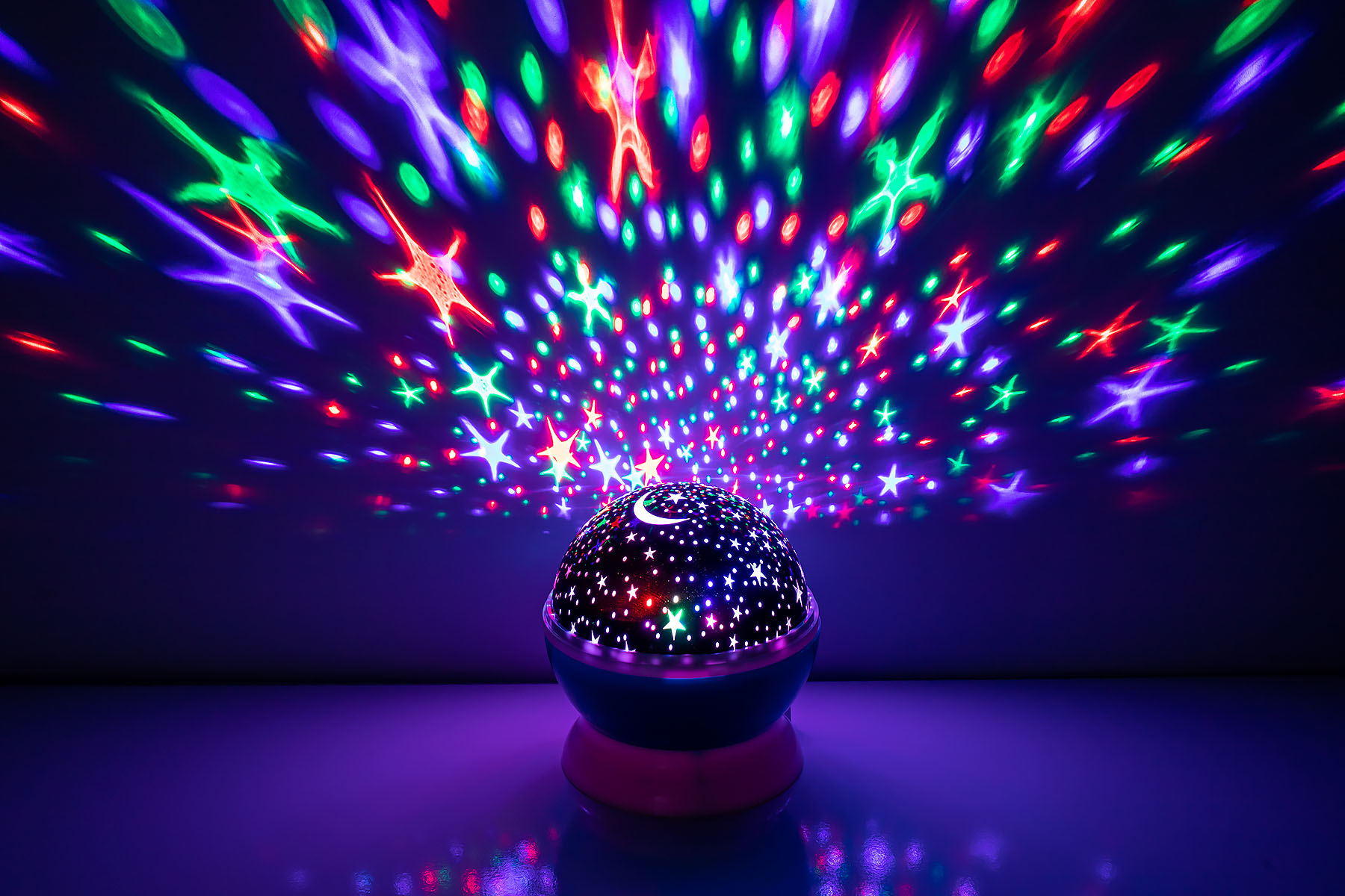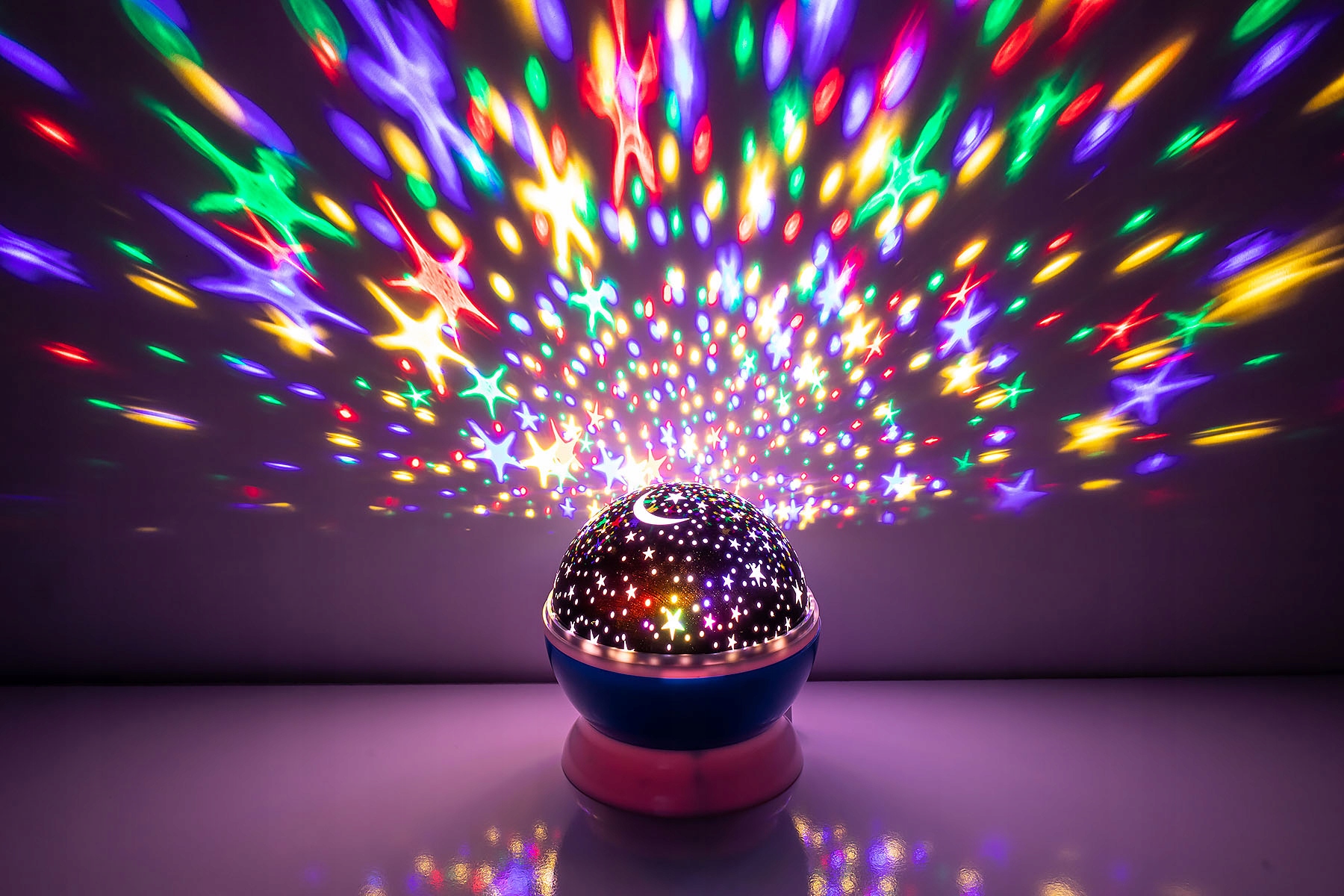 Проектор зоряного неба, який освітить будь-яку кімнату. Створіть чарівну атмосферу в кімнаті вашої дитини за допомогою нашого проектора та дозвольте барвистим ефектам кружляти на стінах і стелі. Проектор відображає проекції у 8 різних кольорах, а також його можна обертати, завдяки чому небо переміщується, що посилює дивовижні візуальні ефекти. М'яч буде ідеальним після настання темряви, коли діти хочуть пограти у своїй кімнаті перед сном або коли їх відвідують друзі, що зробить розвагу ще більш захоплюючим. Також можна покрити головку проектора спеціальною кришкою, яка перетворить обертову кулю на нічну лампу з тонкою інтенсивністю світла.