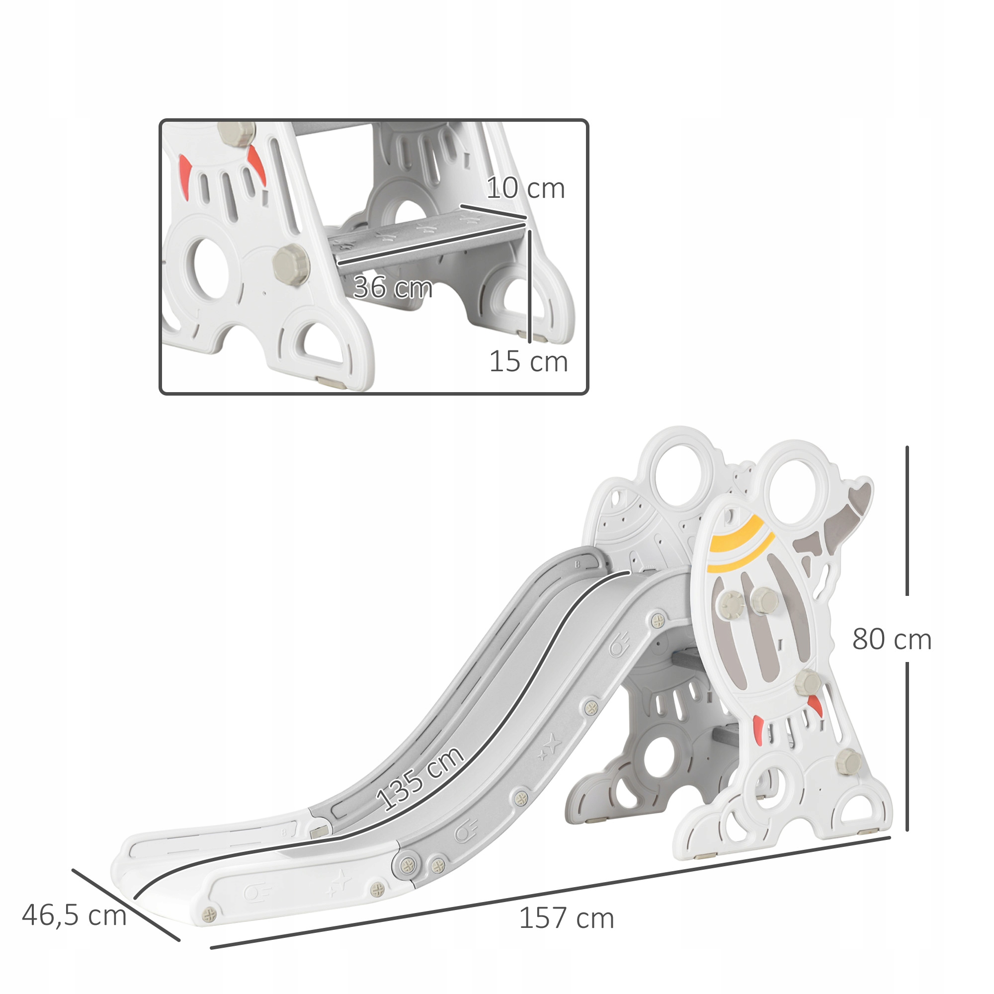 Попрощайтеся з падіннями та подряпинами, які переживає кожна дитина під час гри. Ось рішення: безпечна сходи, що не є, витягнута слайд та надзвичайно великі ручки для певного зчеплення. Але це ще не все: наш слайд має захоплюючу ракетну конструкцію, яка стимулює уяву ваших малюків. Слідкуйте за своїми дітьми годинами "почати ракету", спускайтеся вниз і насолоджуйтесь не лише дуже веселою, але й справжнім кроком.